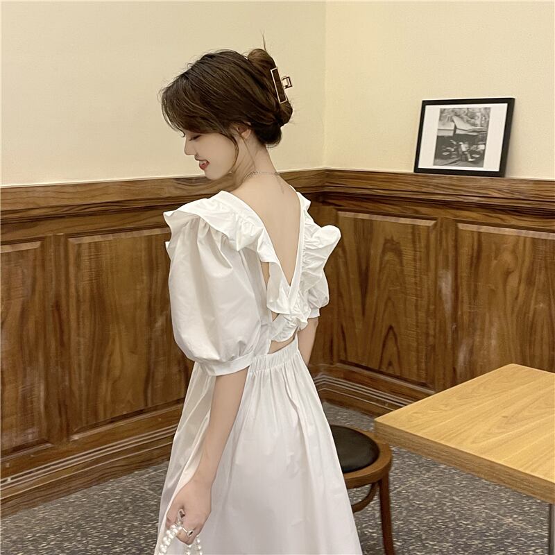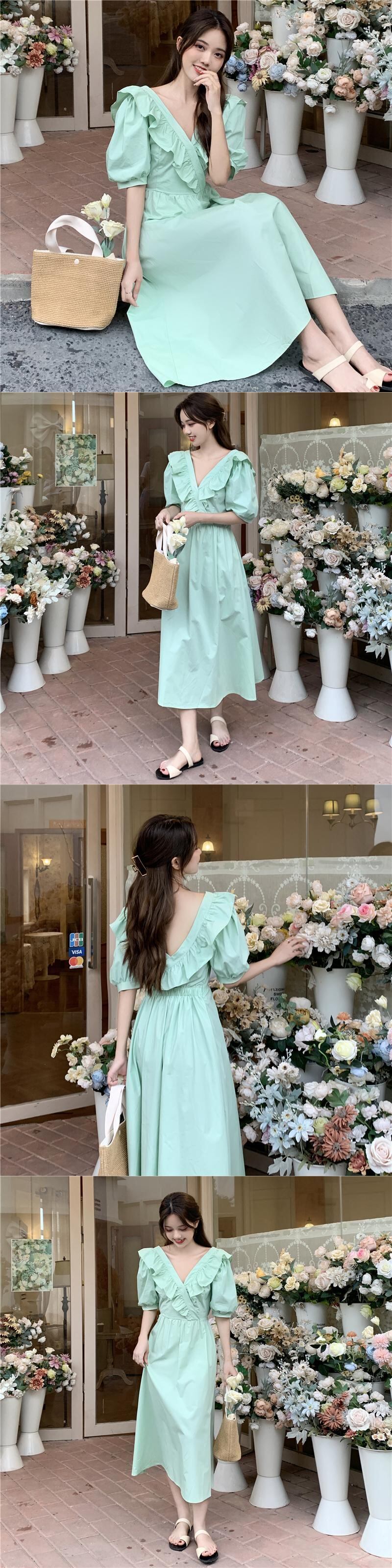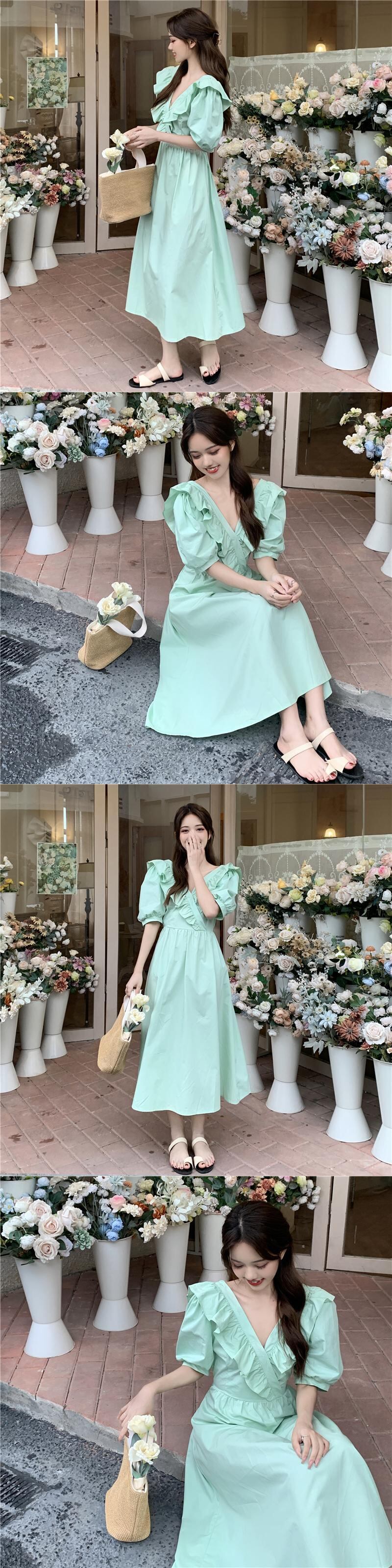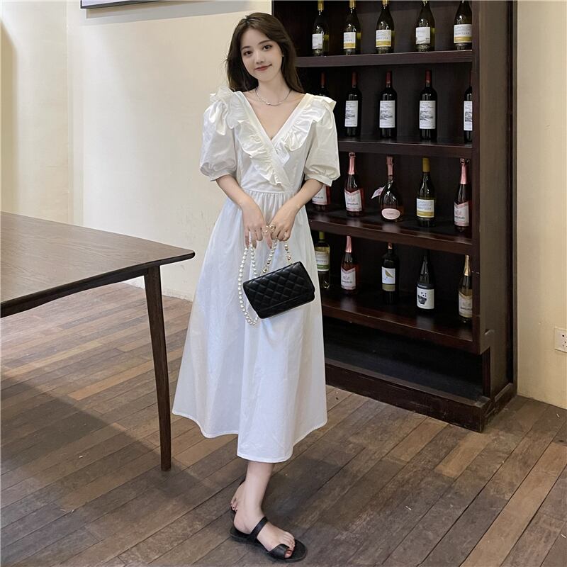 スリーブドレス サマーバックプリーツレースVネックミディスカート 夏物 1号婦人7910586201