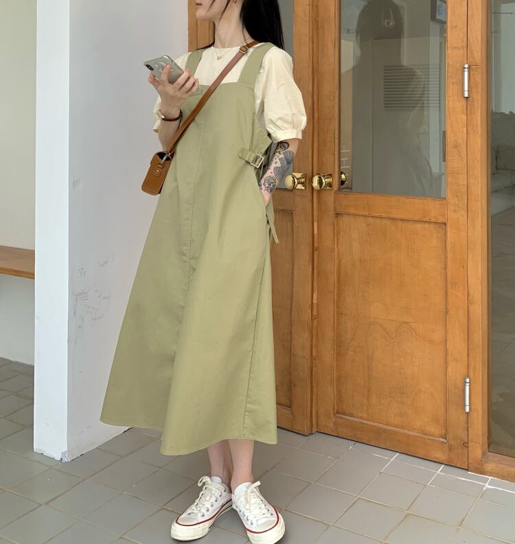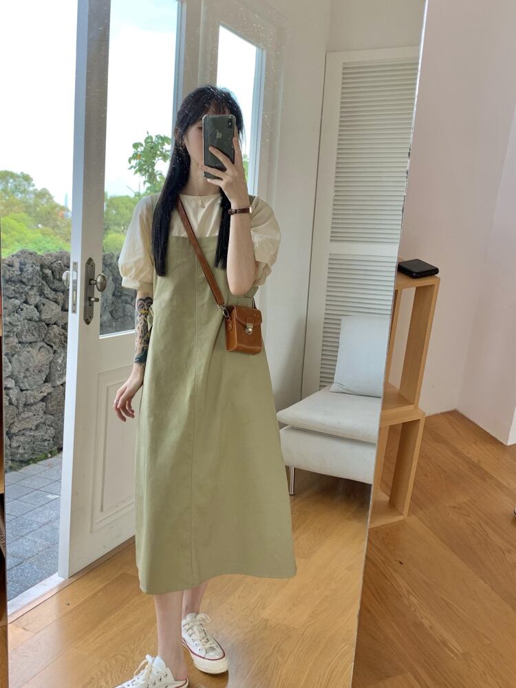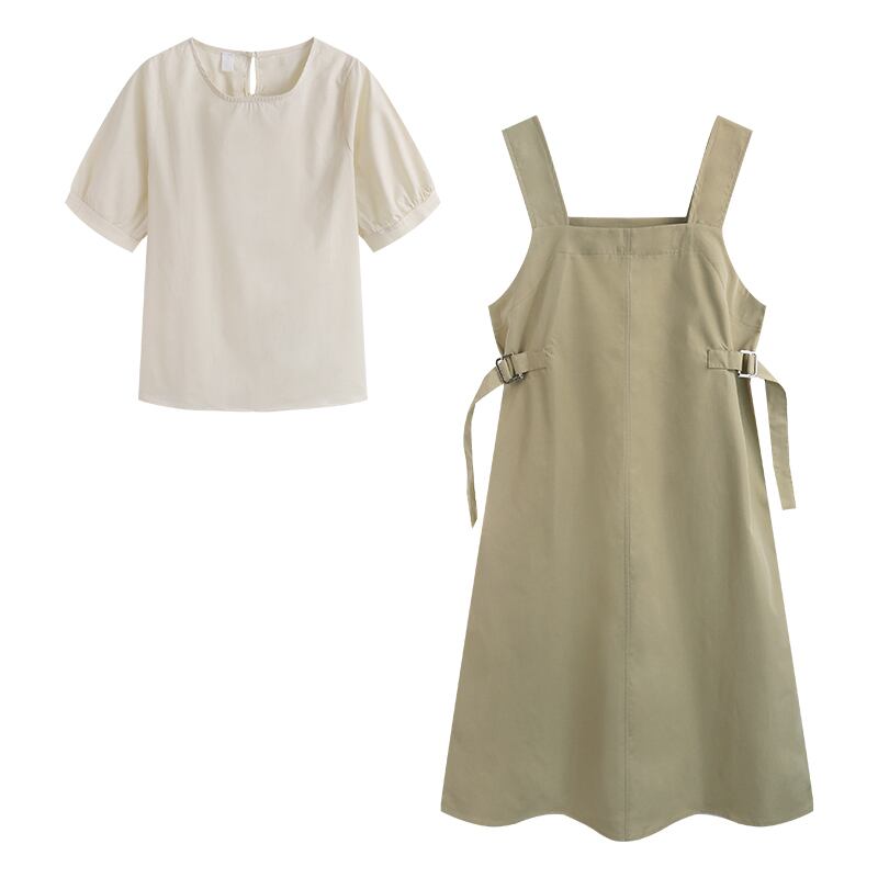 色:アプリコットシャツ,白のシャツ,カーキ色のドレス,緑のドレス