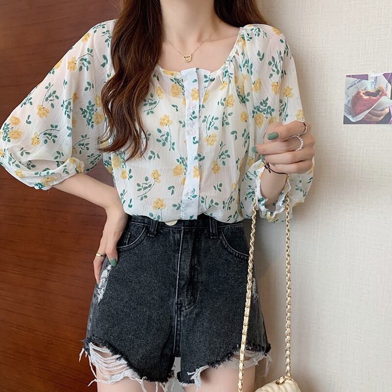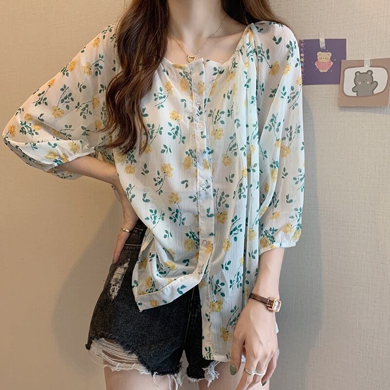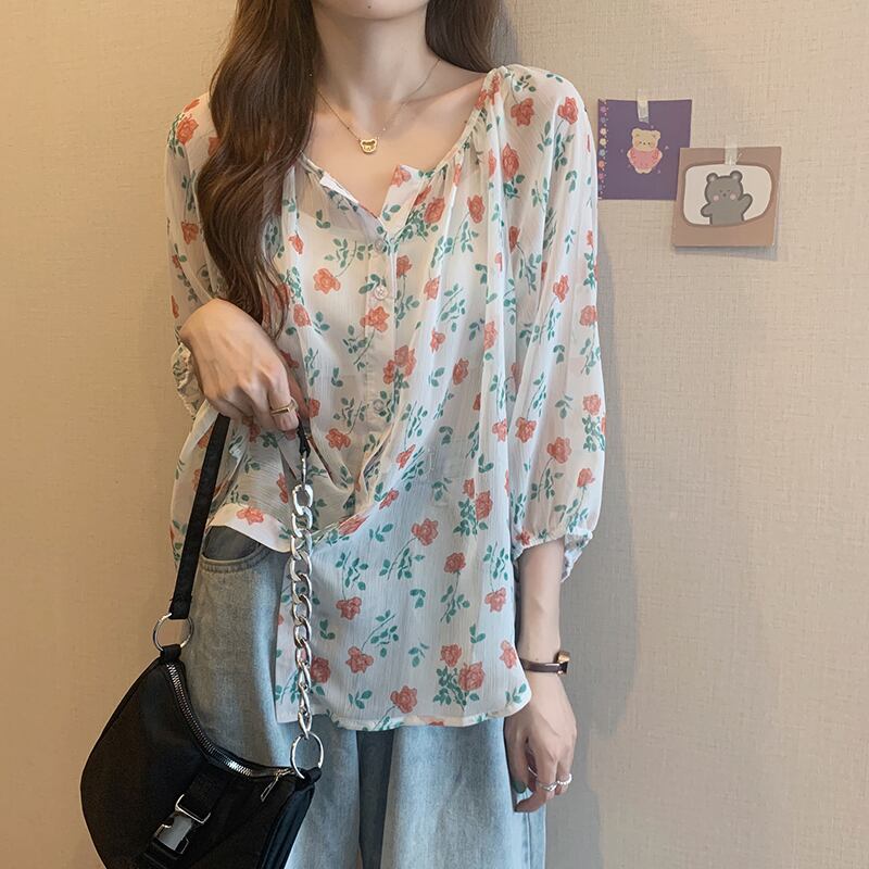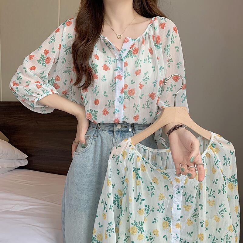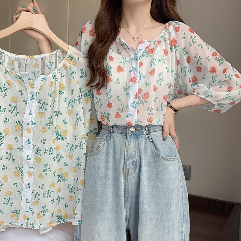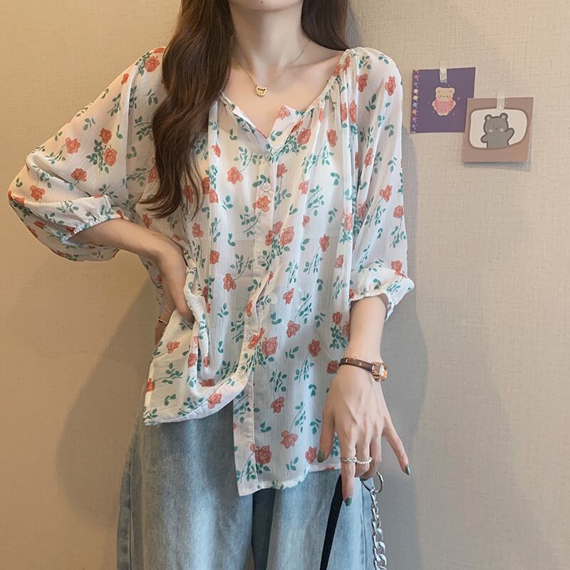 シャツ サマー薄手フローラルスリーブルーズシフォン 夏物 花柄 1号婦人99794539820