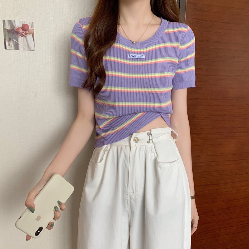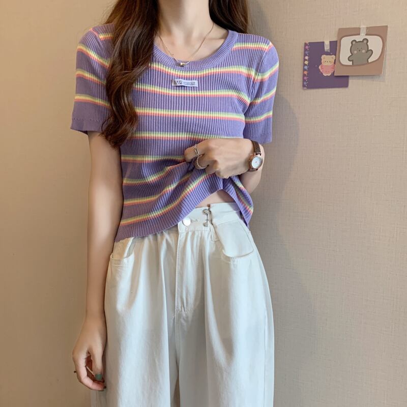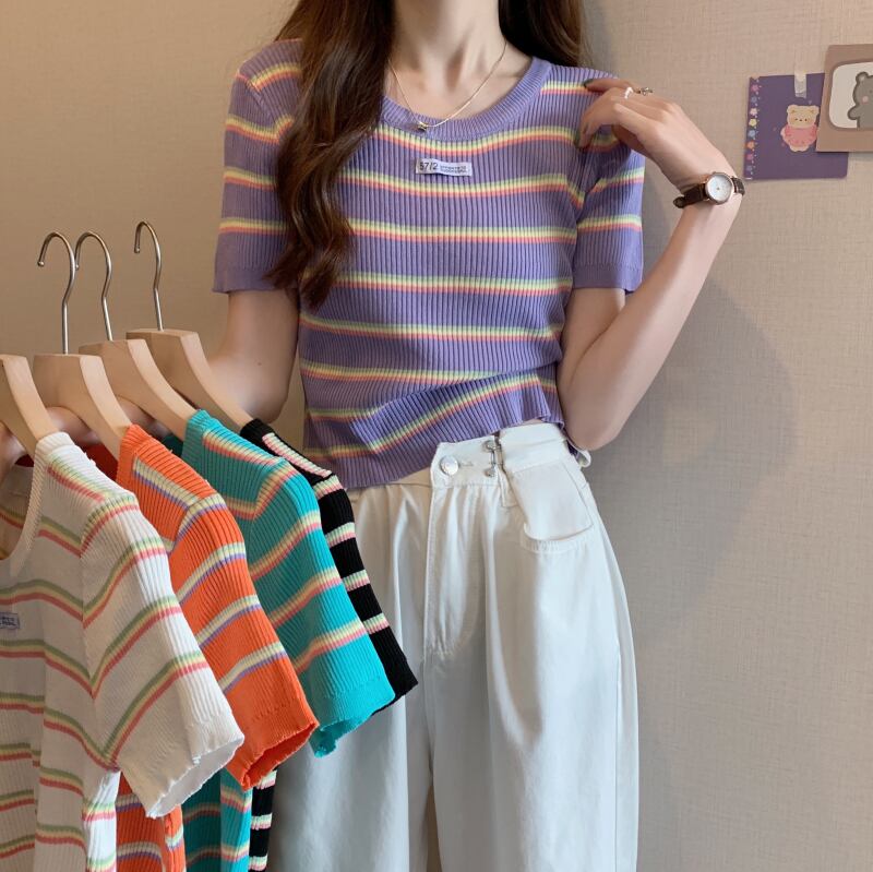 ニットセーター サマー薄手ストライプブラックスリム半袖スリーブトップス ショート ハーフスリーブ 夏物 1号婦人74387210612