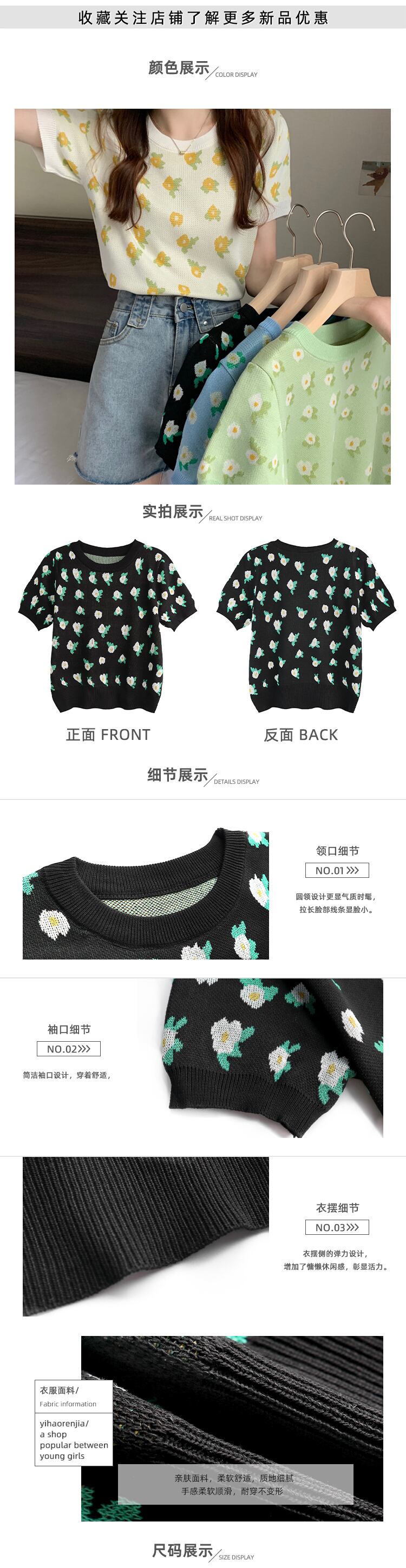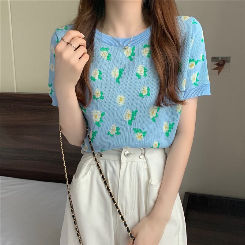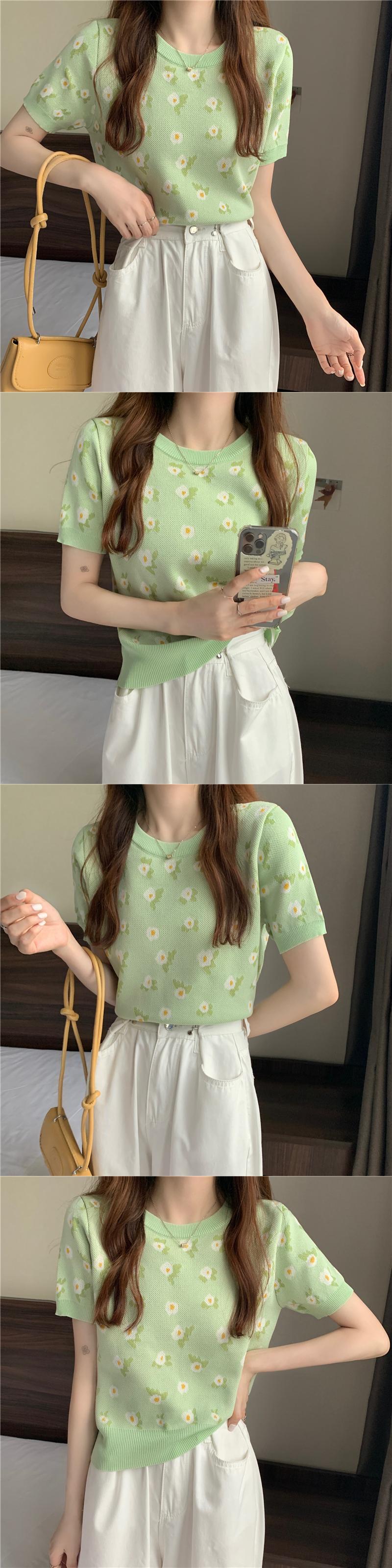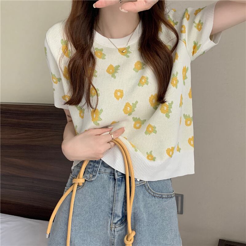 Flowerデザイン ショートハイウェストウェスト半袖スリーブ薄手サマーTシャツ トップス ハーフスリーブ 夏物 フラワーデザイン 1号婦人66402162237