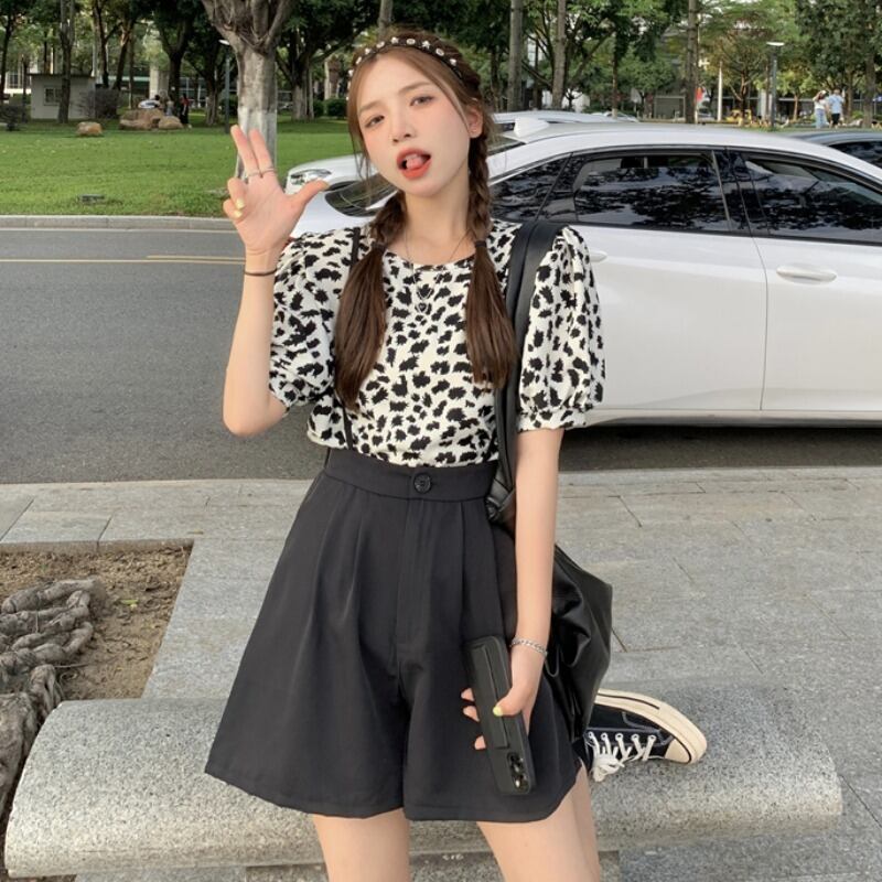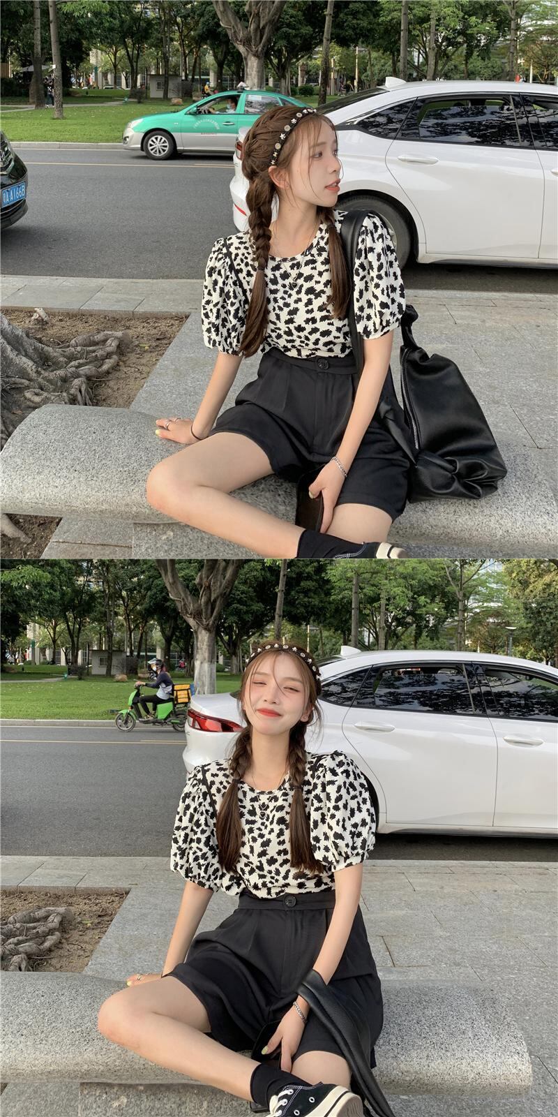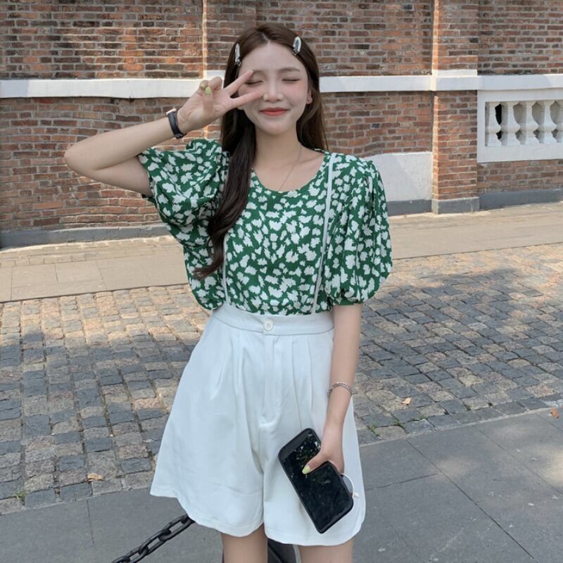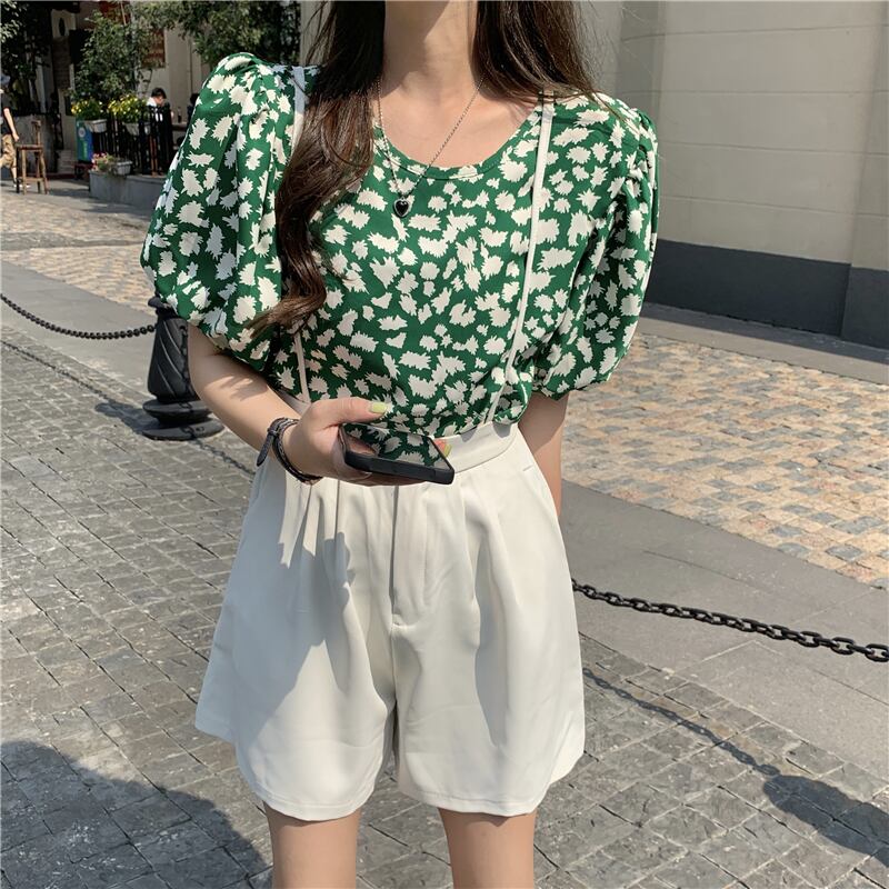 色:グリーンフローラルブラウス,ホワイトフローラルトップ,黒のスーツショーツ,白いスーツのショートパンツ