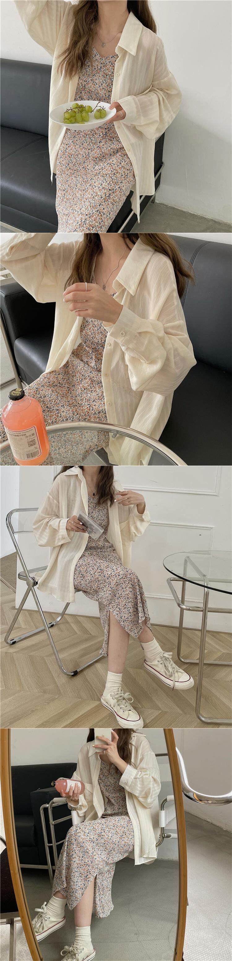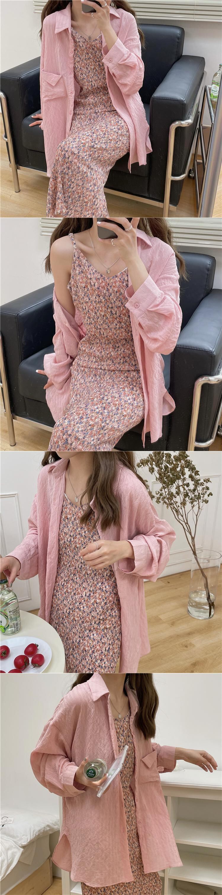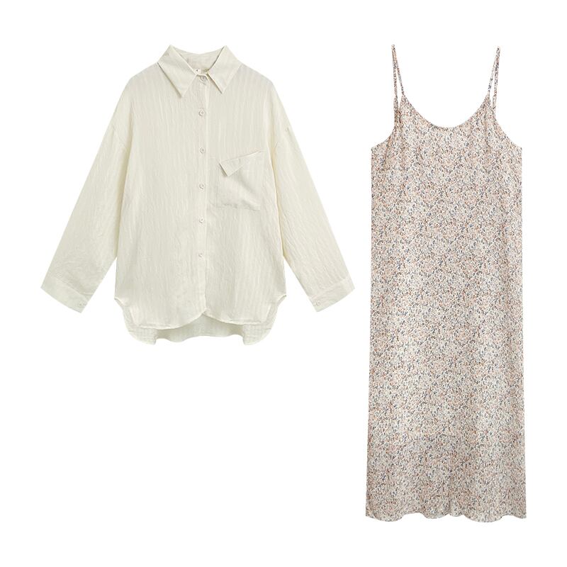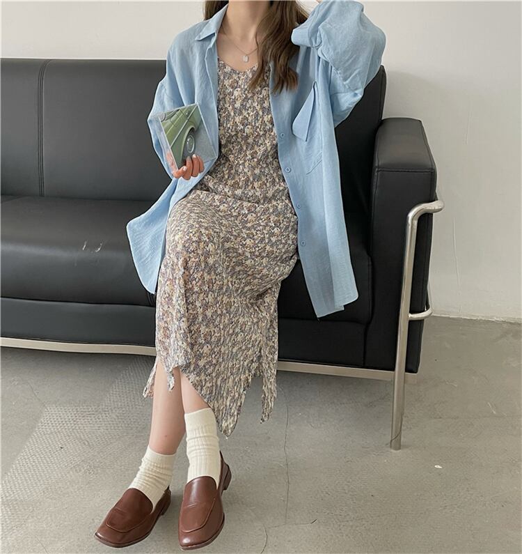 色:青いシャツ,オフホワイトのシャツ,ピンクのシャツ,オフホワイトの花柄サスペンダースカート,ピンクの花柄ドレス,ブルーフローラルサスペンダースカート