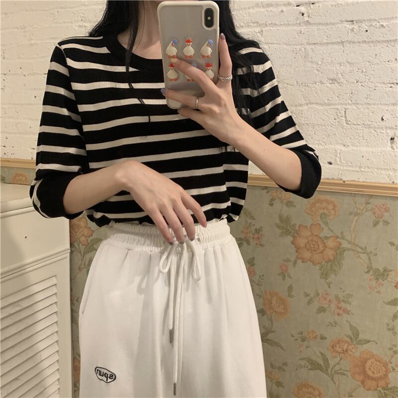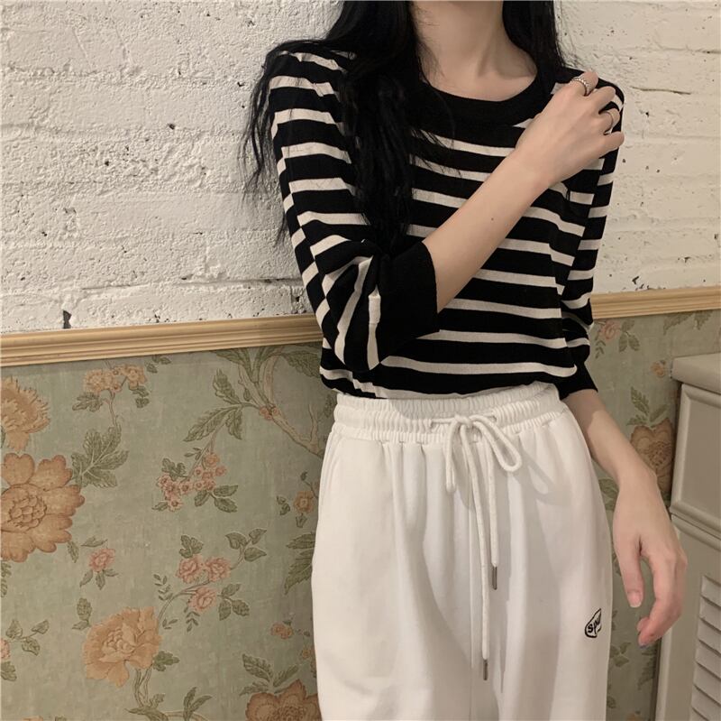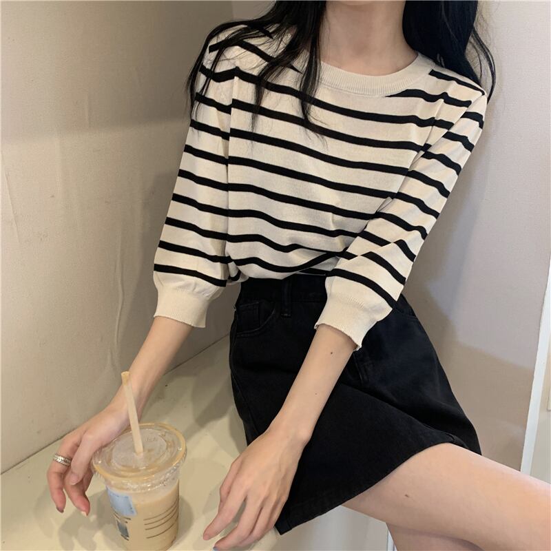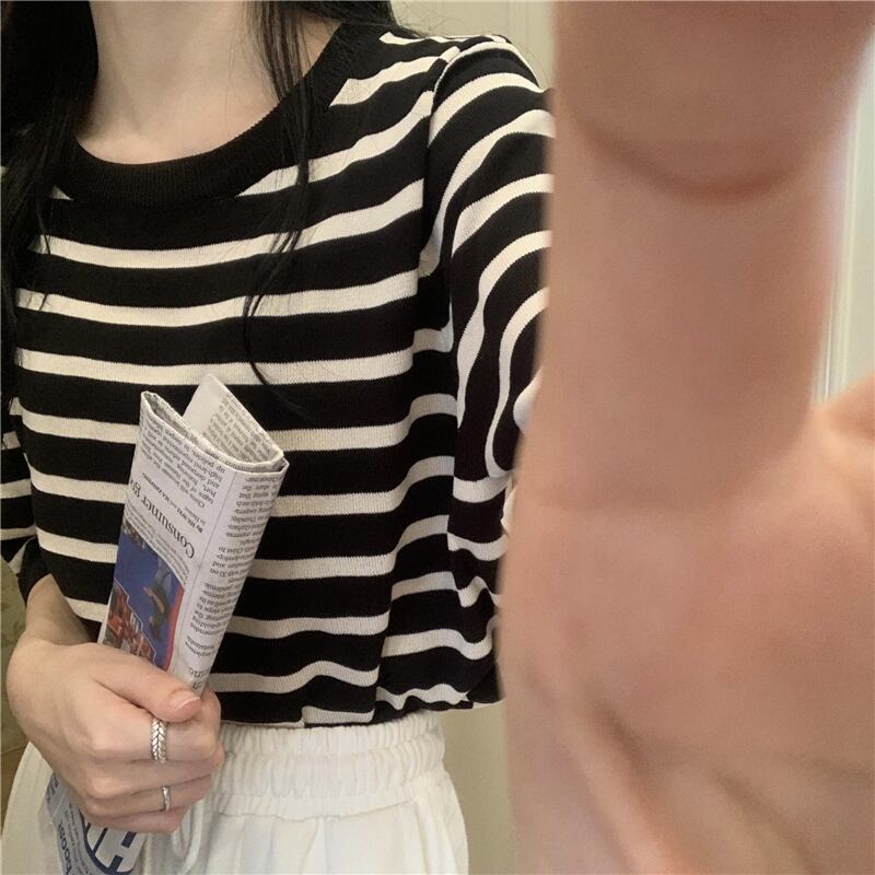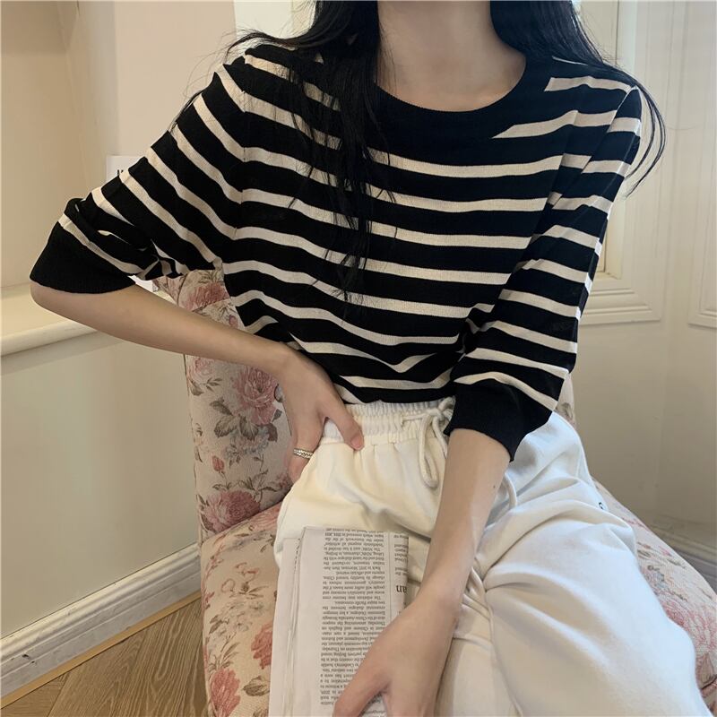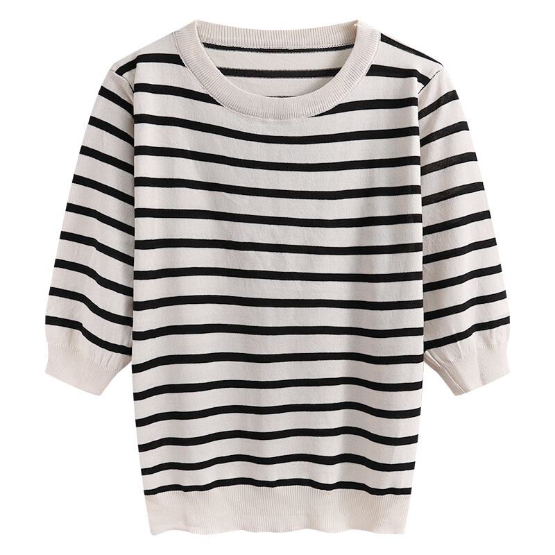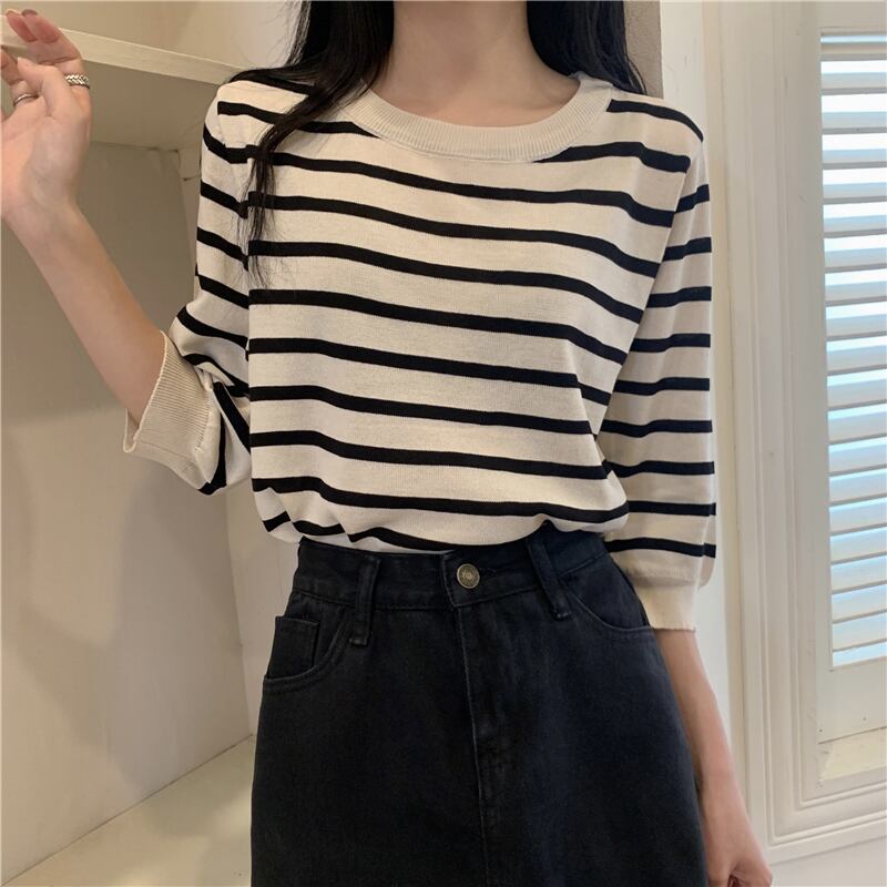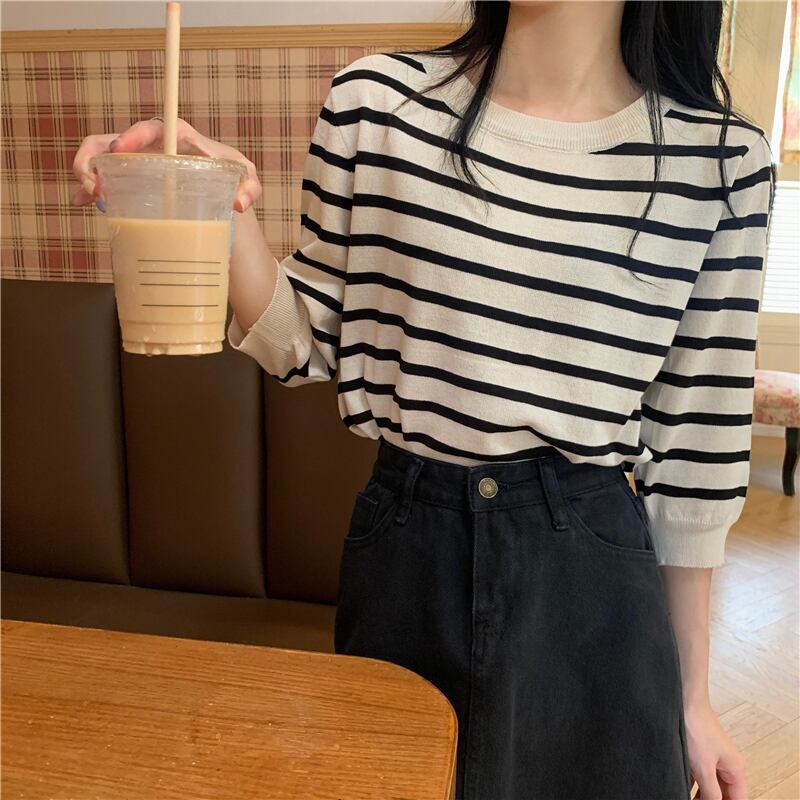 ストライプニットTシャツ サマー薄手 大人ガーリー スウィート キュート カジュアル 夏物 シルク 1号婦人45536584855