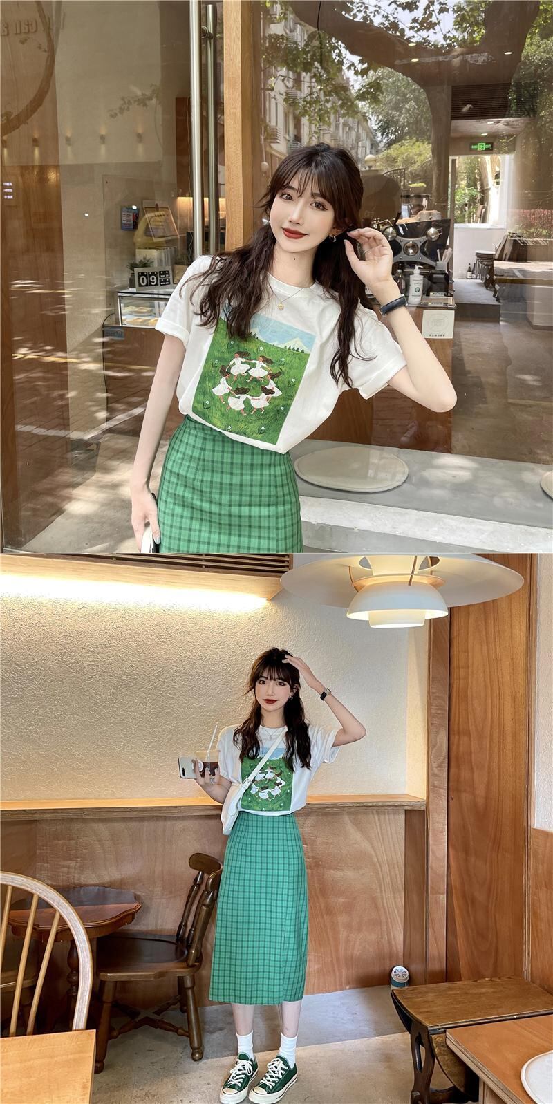 サマードレス カジュアルプリントTシャツ グリーン格子柄スカート 夏物 1号婦人75146107394