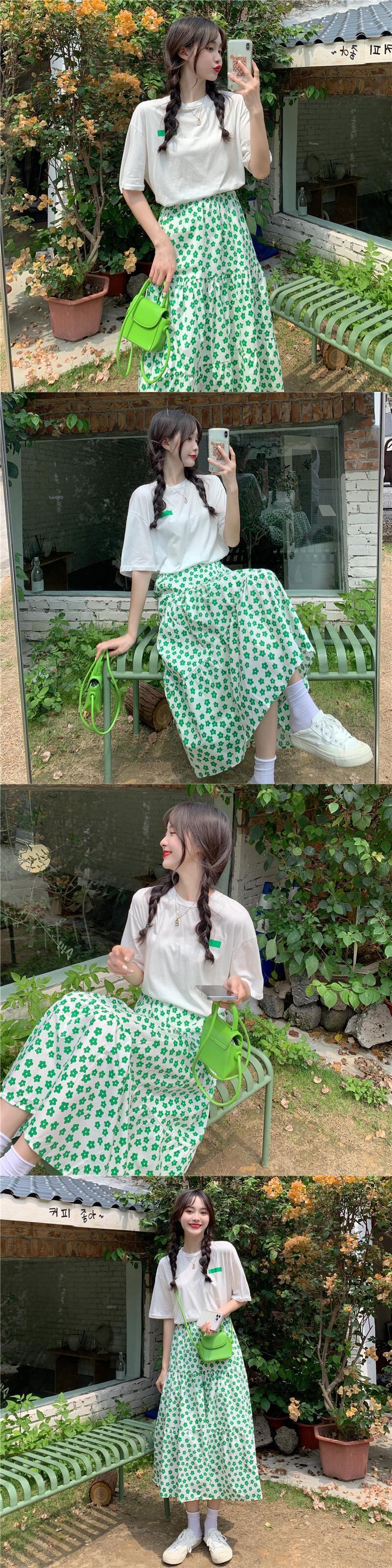 色:プリントグリーンT,印刷された黄色のT,黄色のスカート,緑のスカート