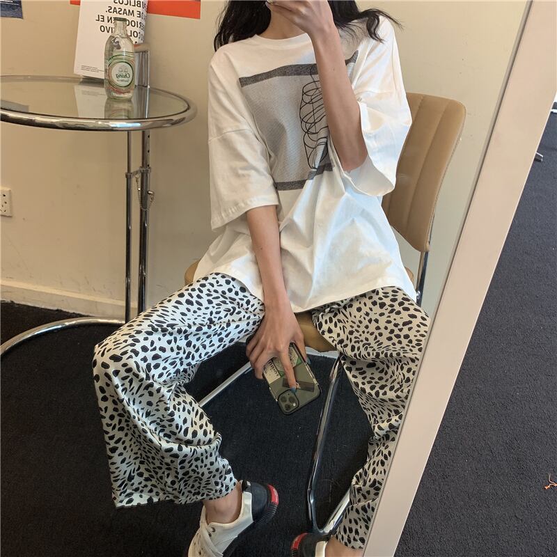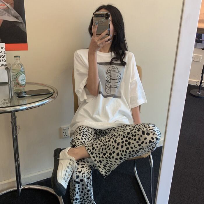 色:白いTシャツ,ヒョウ柄パンツ