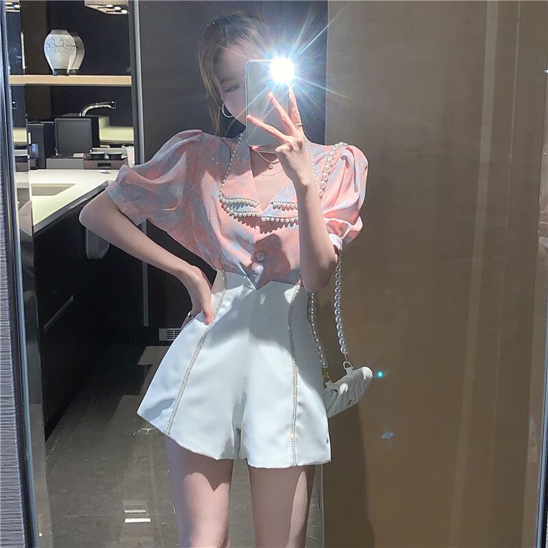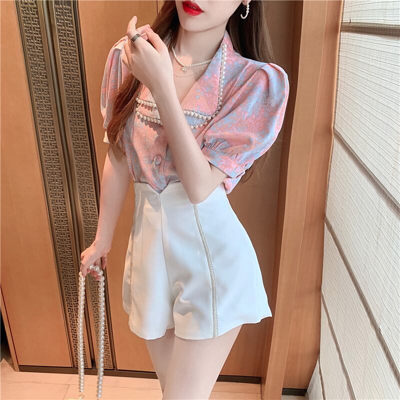 サマーカジュアルレディースレッドスリーブシャツ ワイドレッグショーツ 夏物 ブルマー ワイドパンツ 1号婦人55186428350