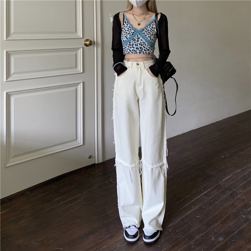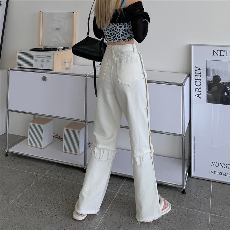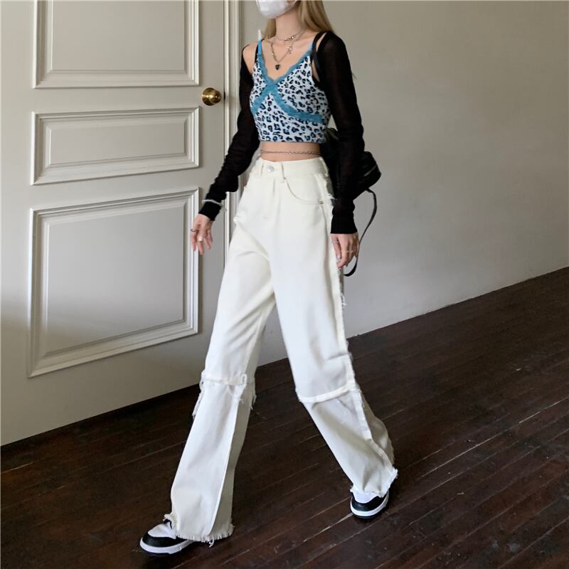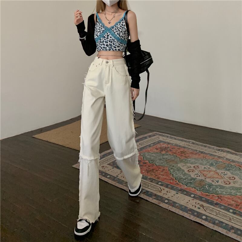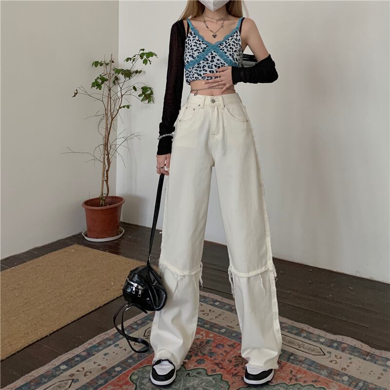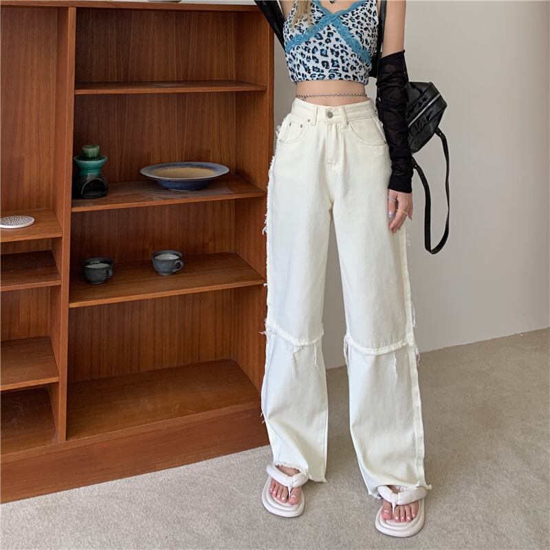 ジーンズ サマー薄手ルーズパンツ ウェストホワイト 夏物 ワイドレッグ ワイドパンツ 1号婦人82163755782