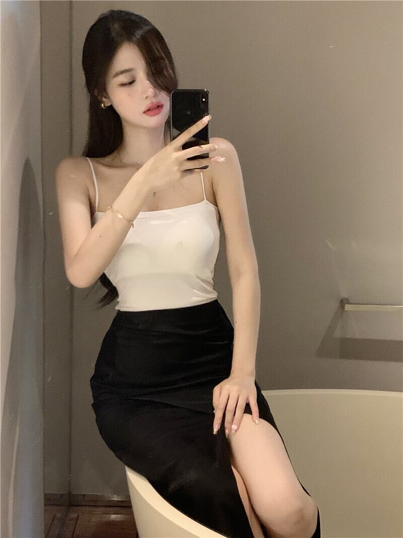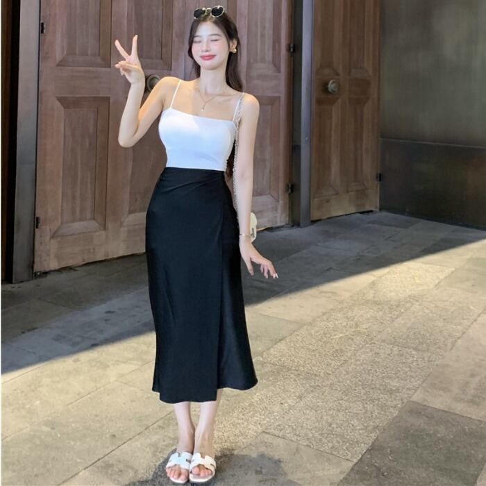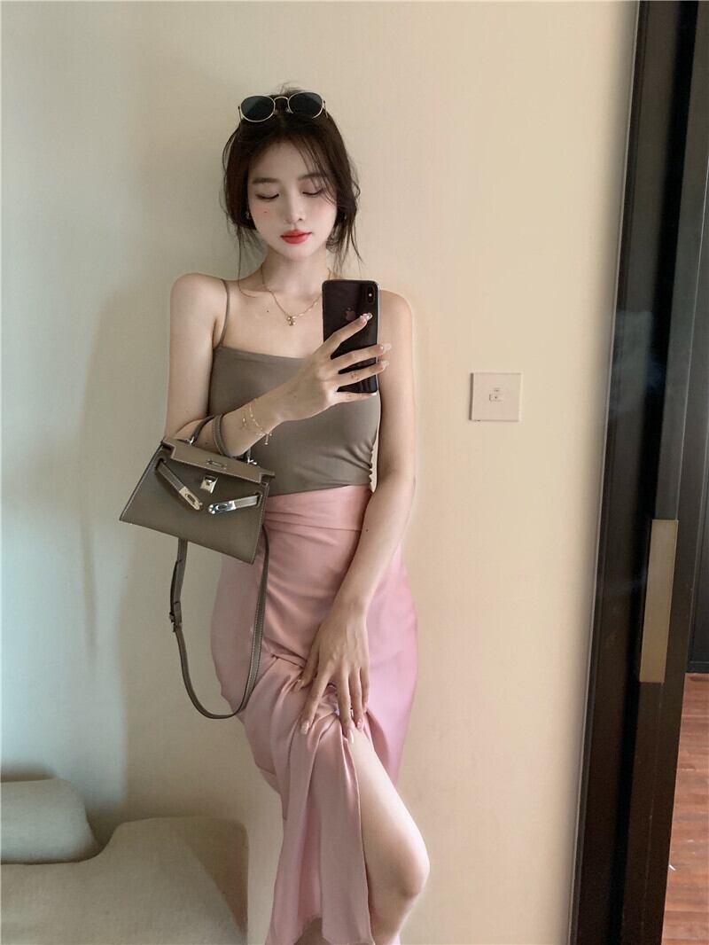 色:7043コーヒーカラーキャミソール,7043ホワイトキャミソール,7044ピンクのスカート,7044黒のスカート