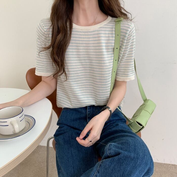 ニットストライプTシャツ 薄手サマートップス 夏物 シルク 1号婦人80417330790