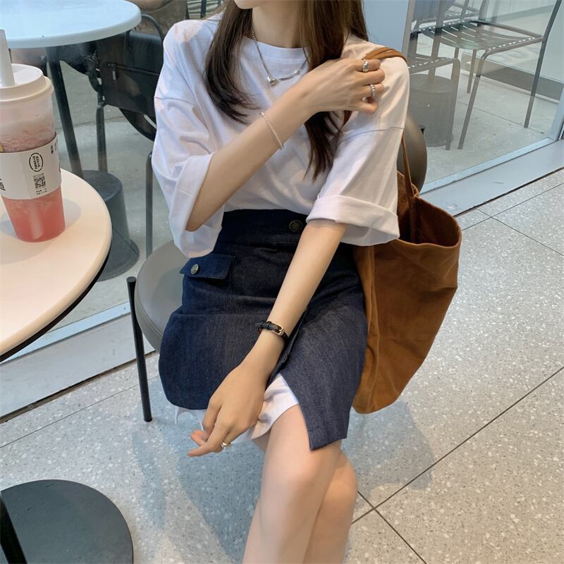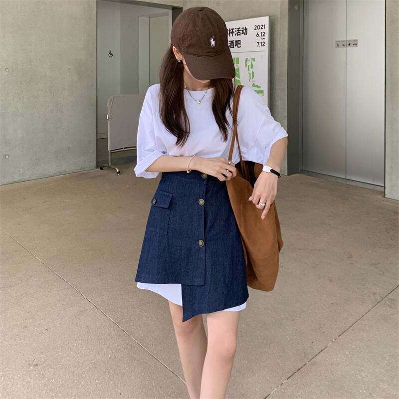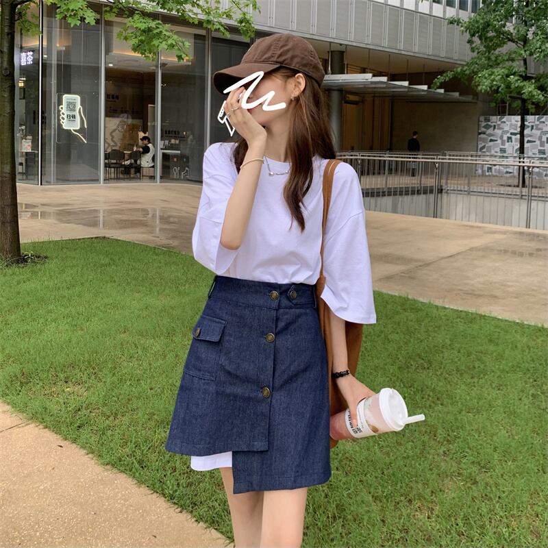 色:ホワイトTシャツトップ,青いスカート