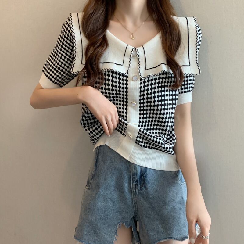 ネイビーカラー格子柄セーター サマー薄手スタイルルーズショートトップス 夏物 1号婦人76489886054