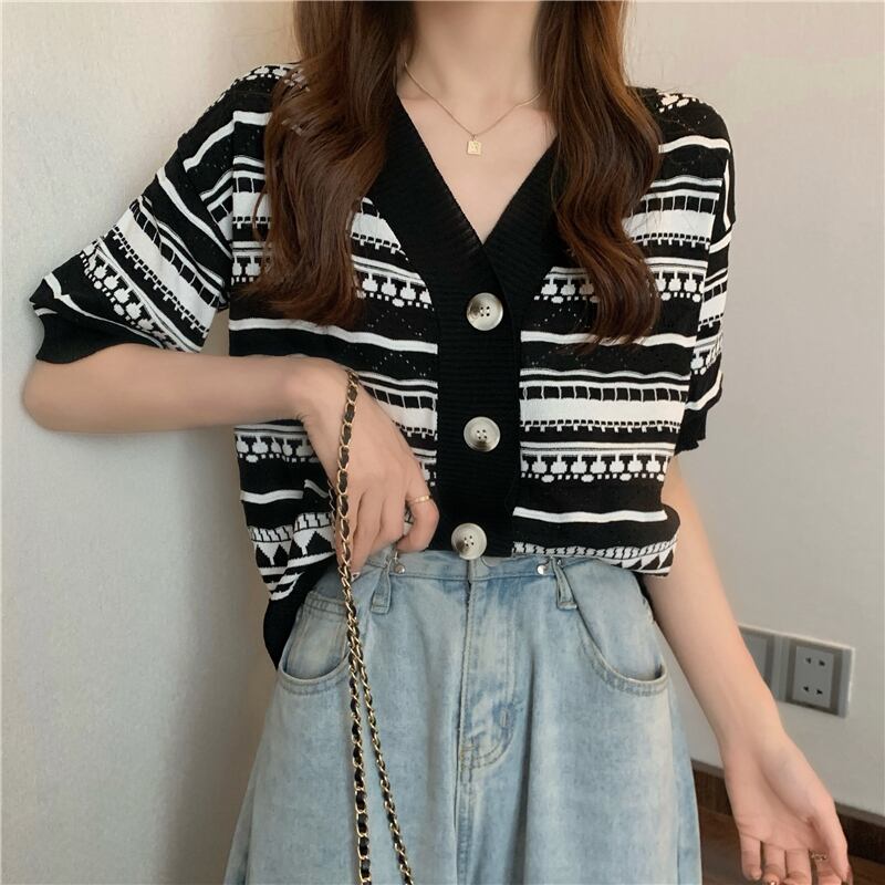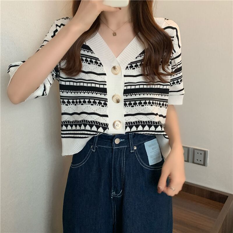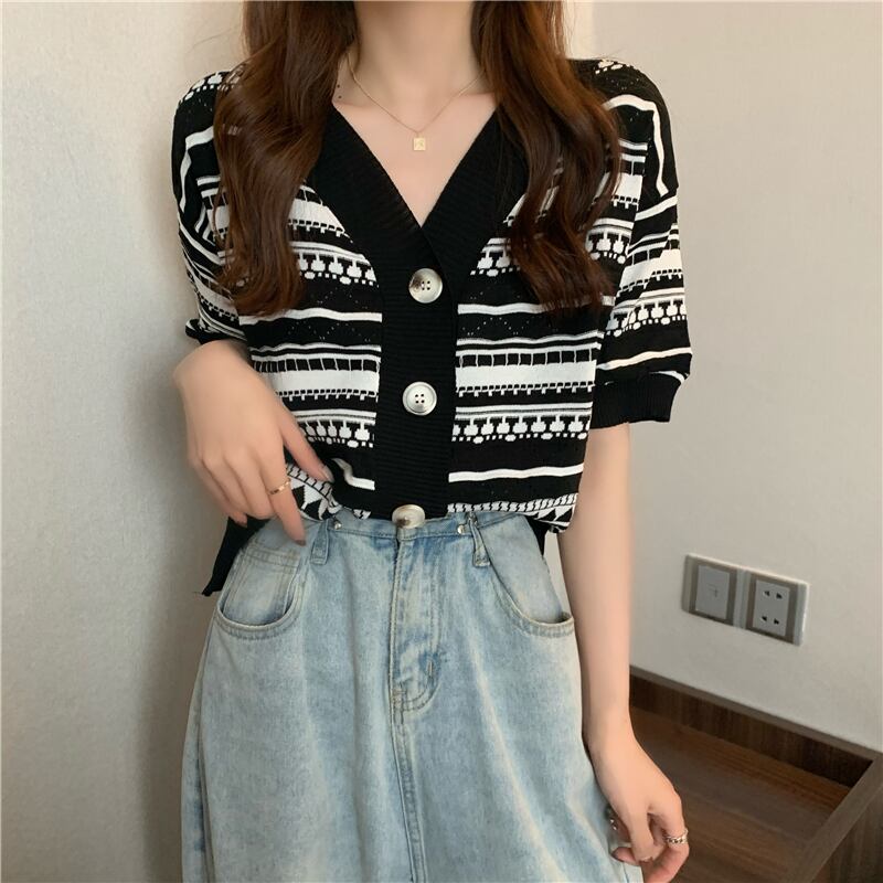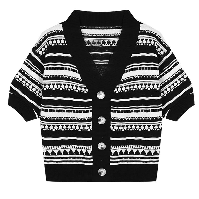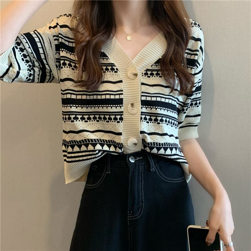 薄手カーディガンVネックセーター スプリングサマープリントトップス 春物 夏物 1号婦人57620159059