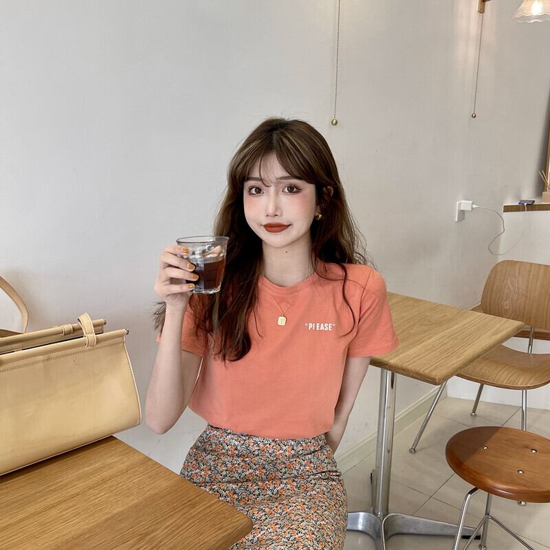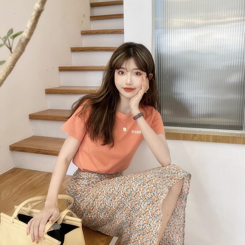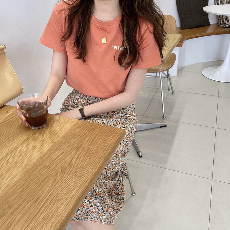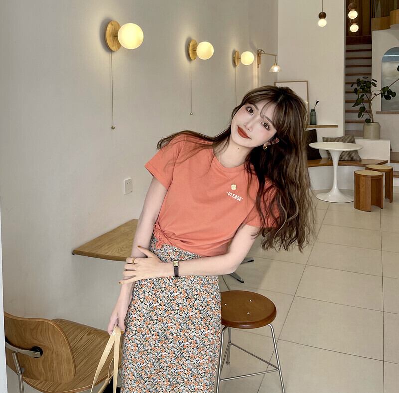 色:オレンジ色のtシャツ,アプリコットTシャツ,オレンジフローラルスカート,アプリコットフローラルスカート
