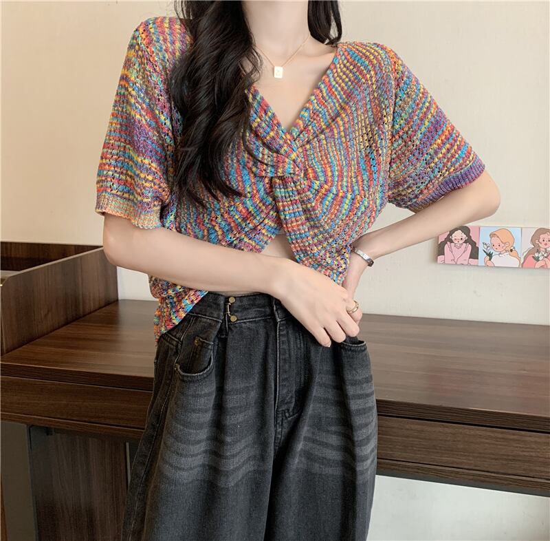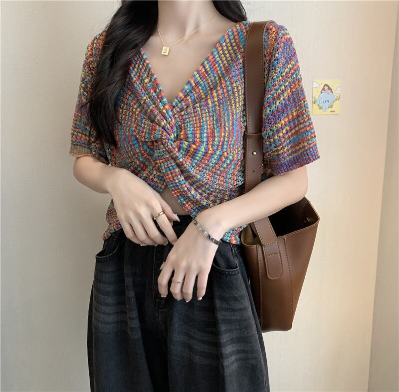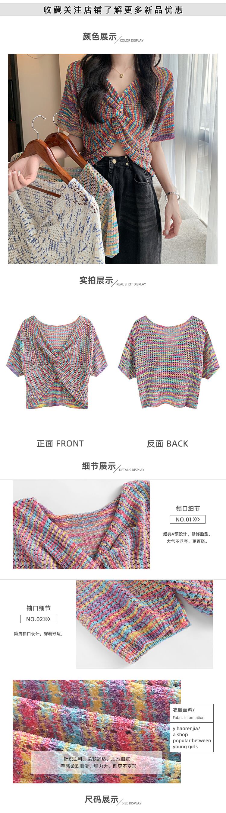 スプリングサマーニットセーター レディーススタイルVネックショートトップス 春物 夏物 ステッチ 1号婦人68520296600