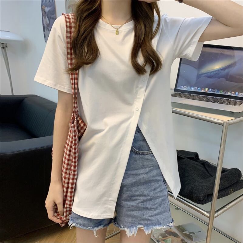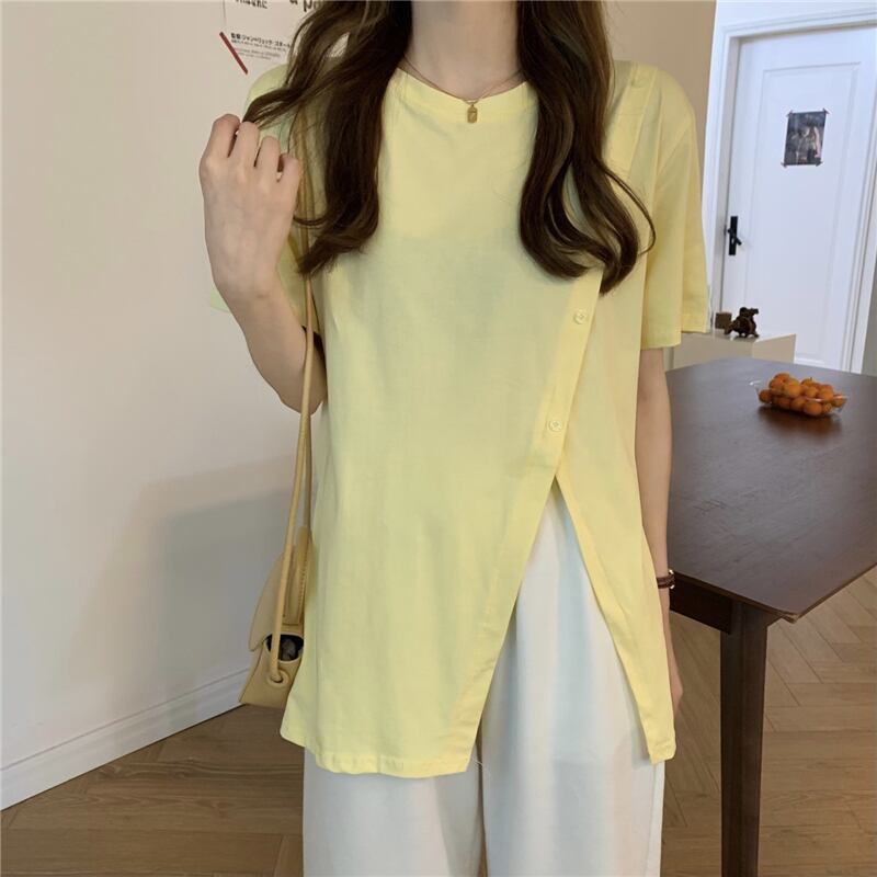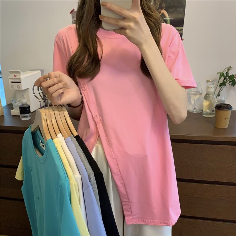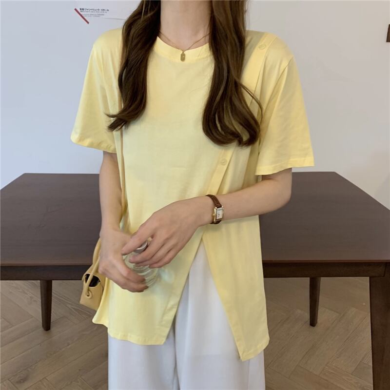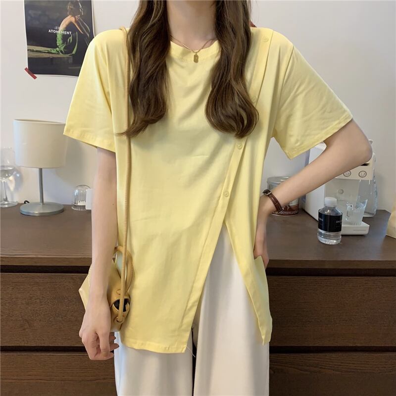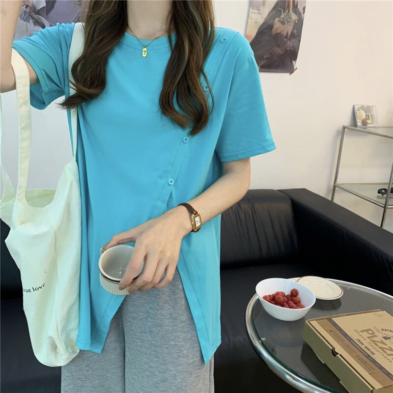サマーTシャツ ルーズ薄手ソリッド カラーボタントップス 夏物 ソリッドカラー 1号婦人5760663438