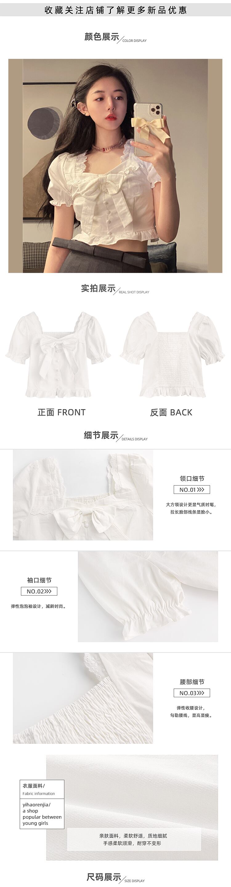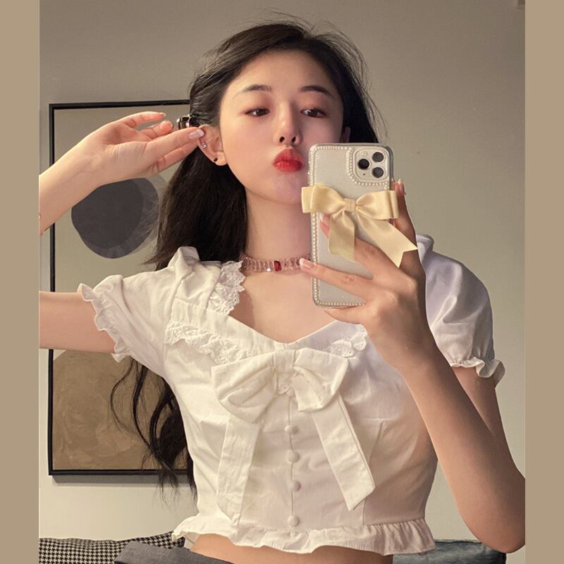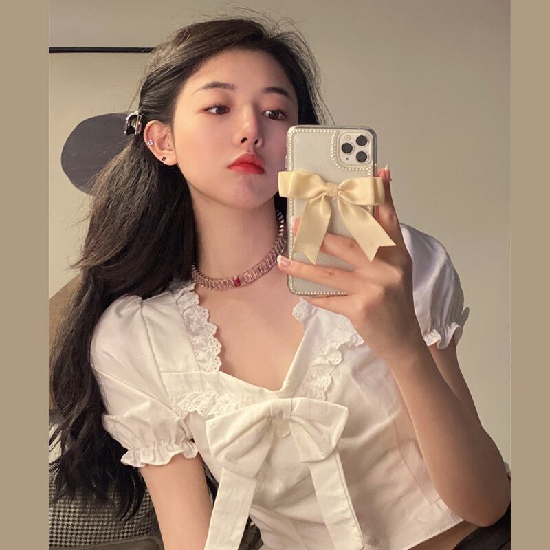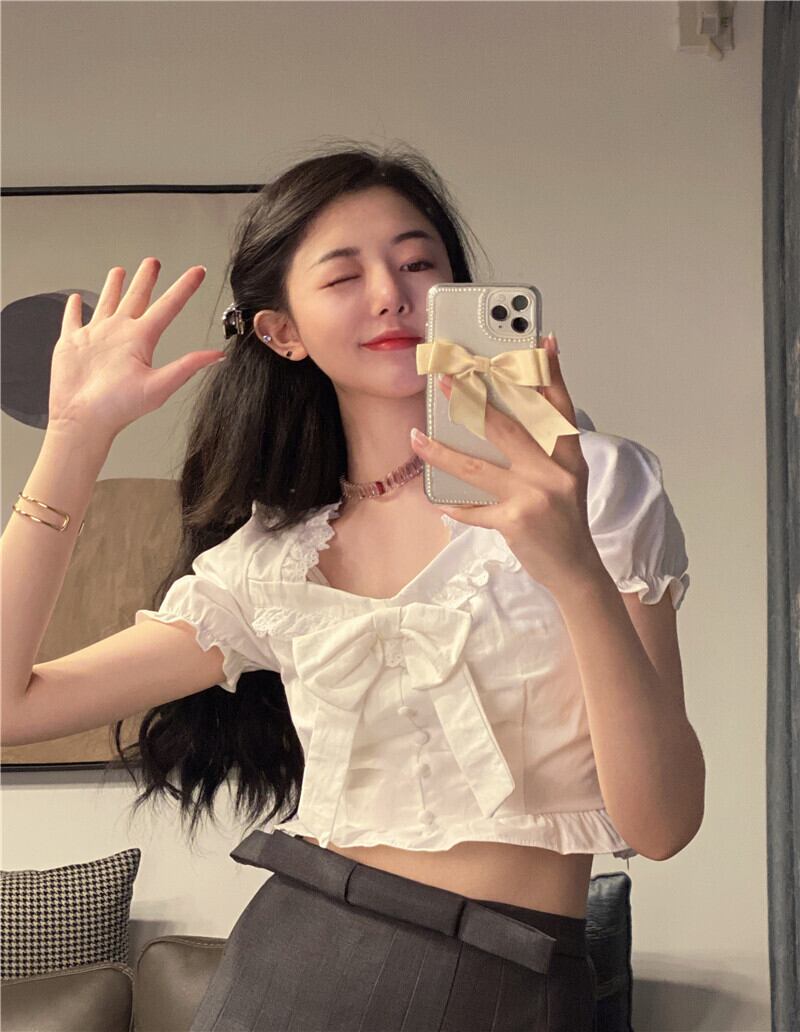 ショートトップス サマースタイルホワイトリボンシャツ 大人ガーリー スウィート キュート カジュアル 夏物 1号婦人99616448463