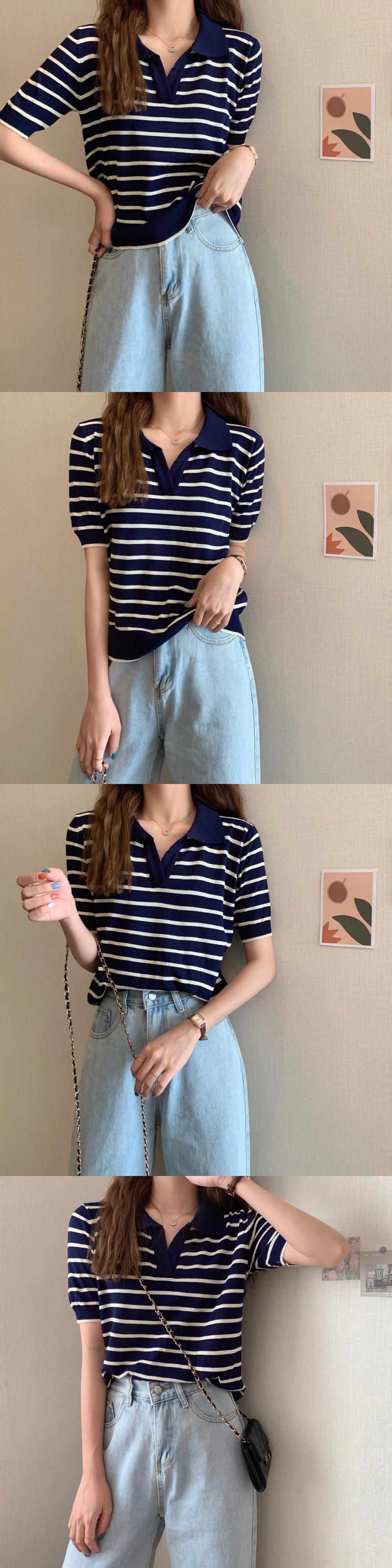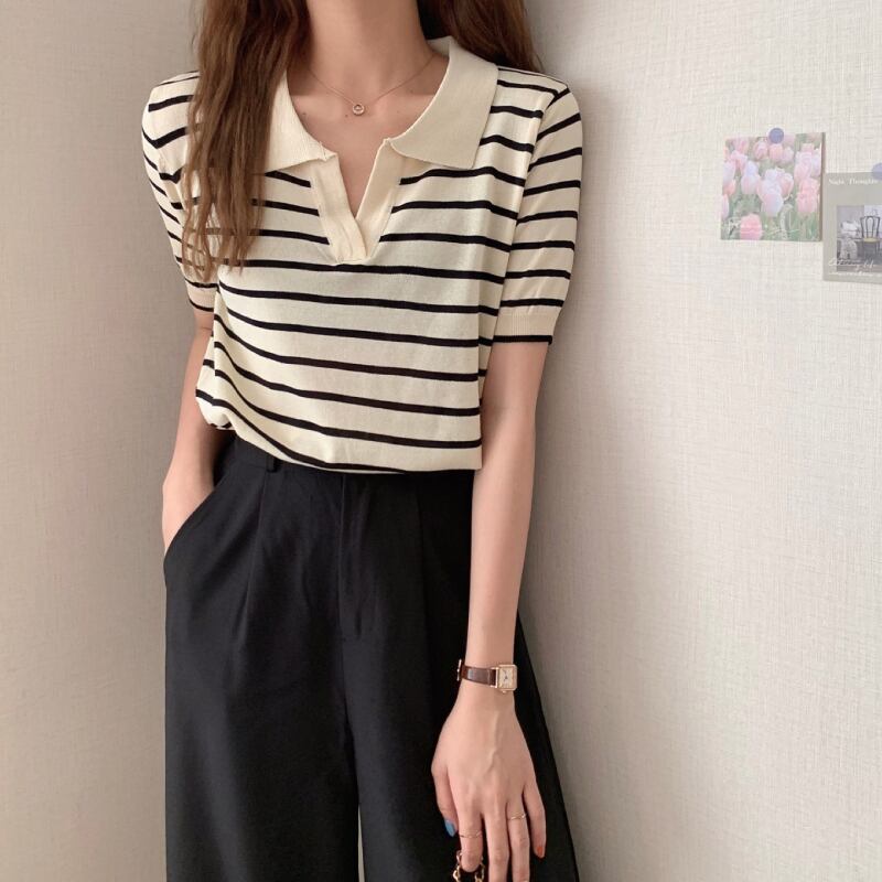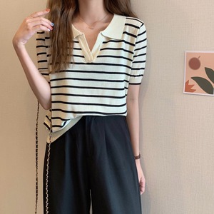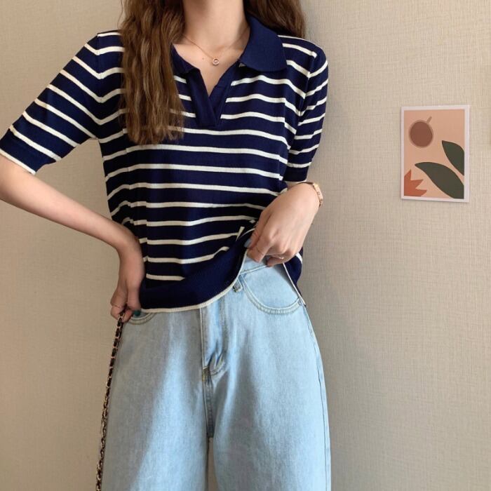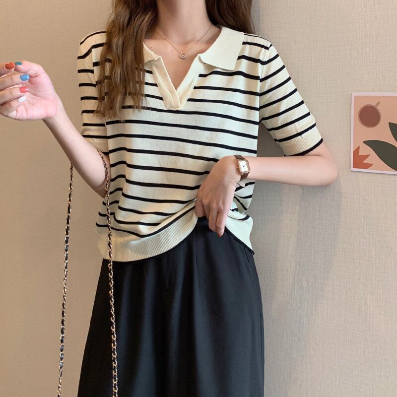 ニットセーター レディースサマー薄手VネックストライプTシャツ ルーズトップス 夏物 1号婦人49884668894
