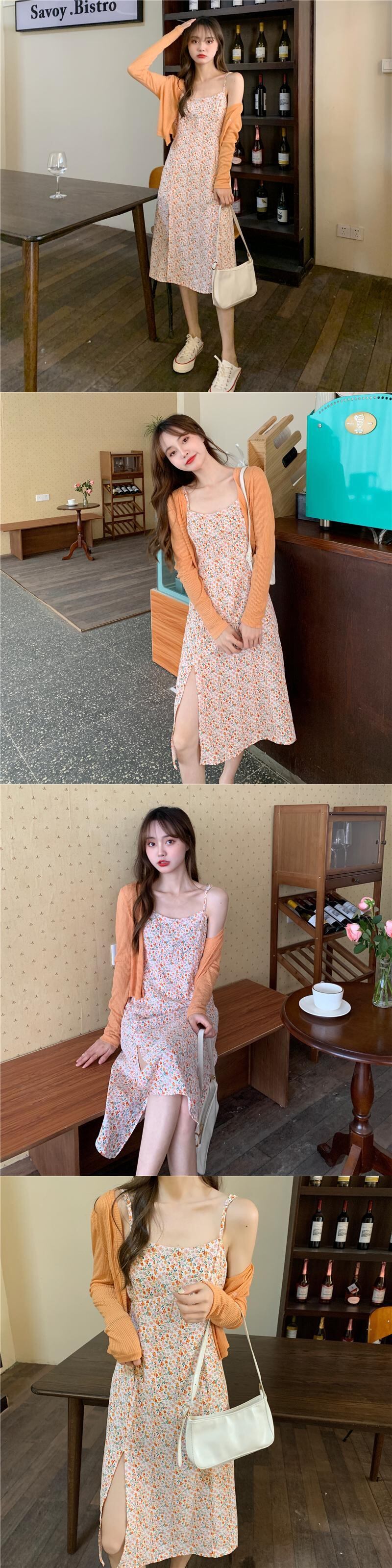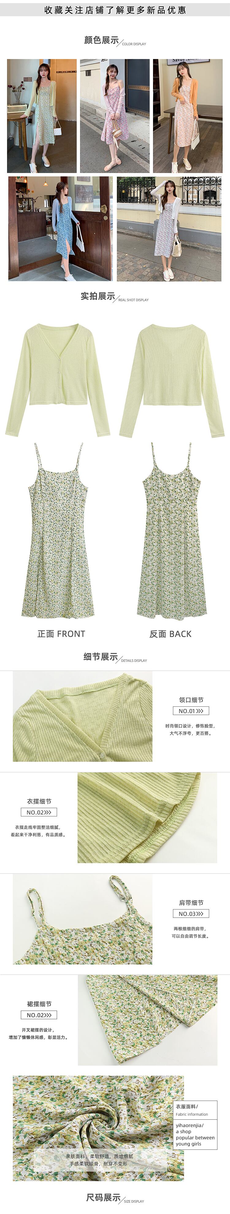 色:白いカーディガン,グリーンカーディガン,ピンクのカーディガン,オレンジカーディガン,ブルーカーディガン,緑のドレス,青い服,ピンクのサスペンダードレス,オレンジサスペンダースカート,パープルホルタードレス