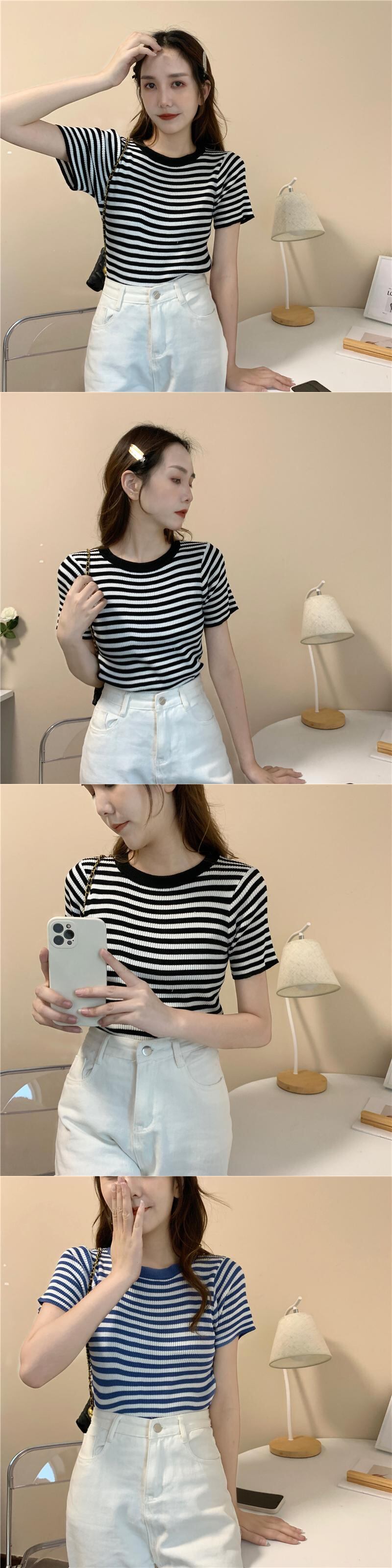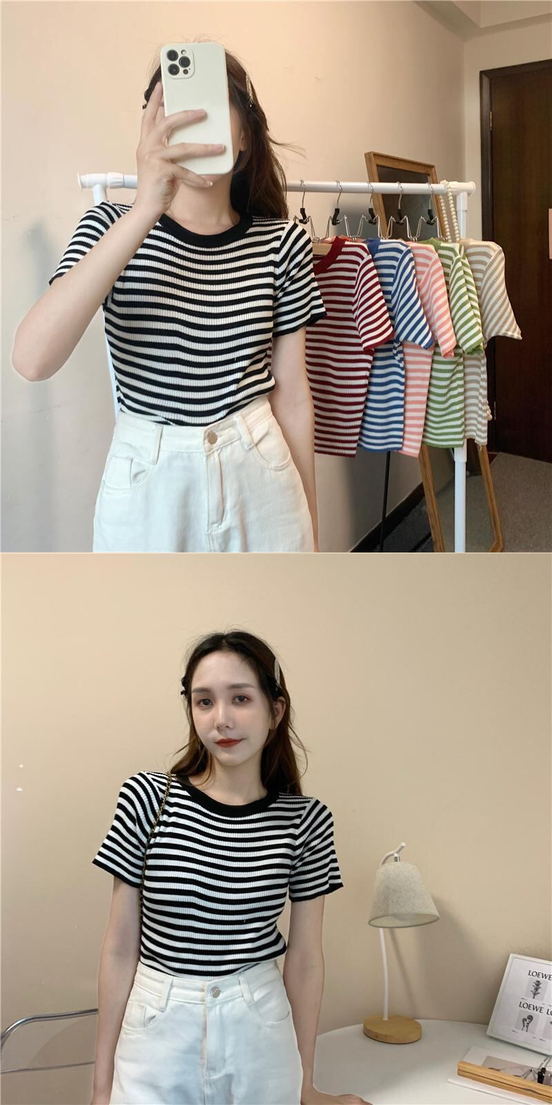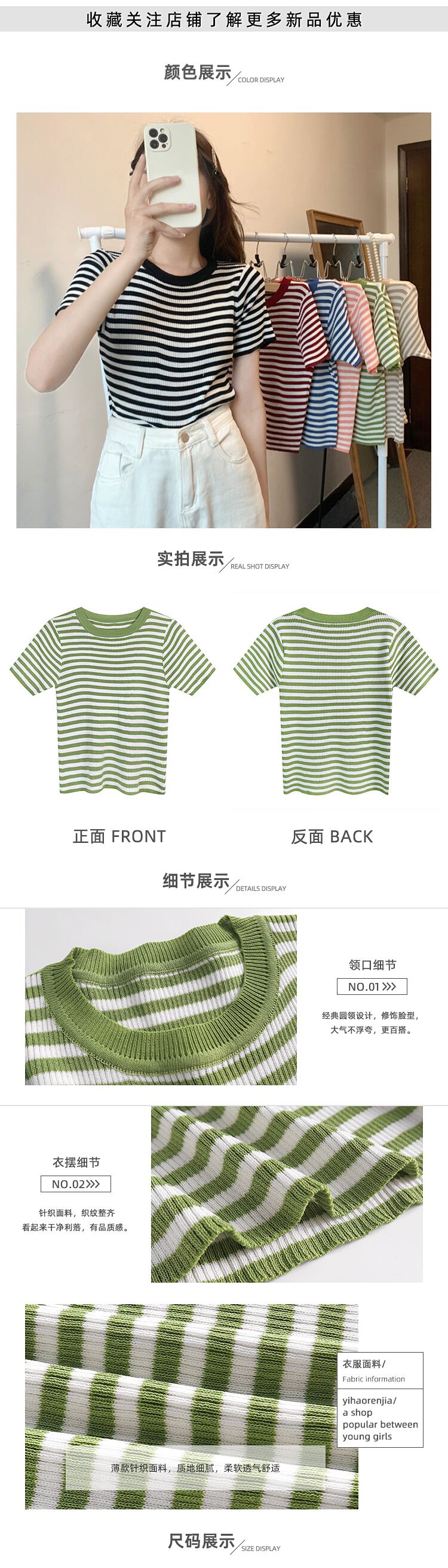 トップス Tシャツ サマーグリーンストライプラウンドネック 夏物 Oネック 1号婦人53906340926