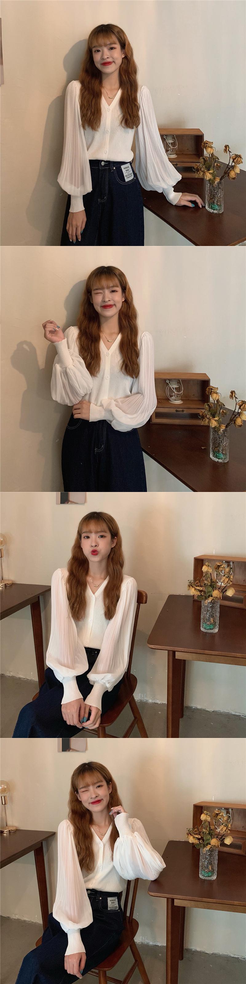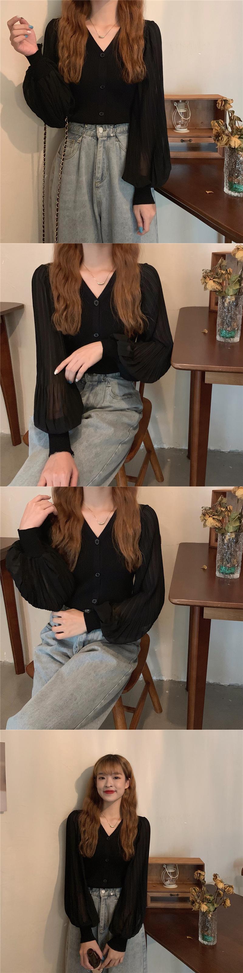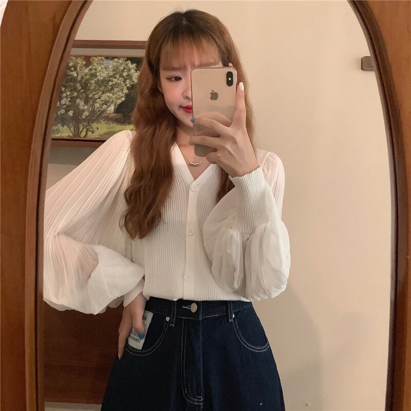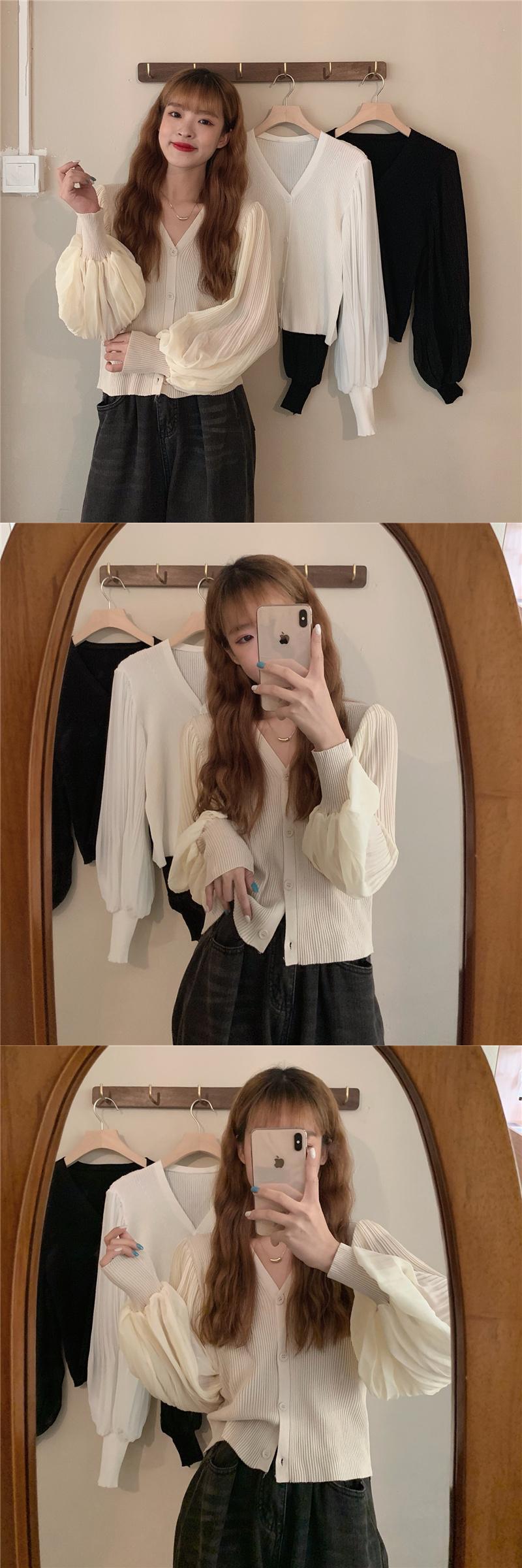 ニットセーター レディースオータム薄手スタイルVネックスリーブシフォンカーディガントップス ランタンスリーブ 秋物 ステッチ 1号婦人13588824330