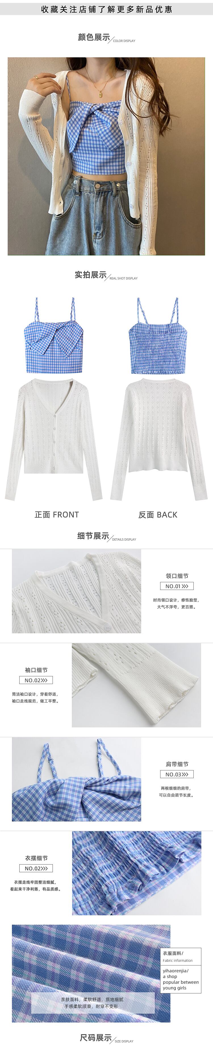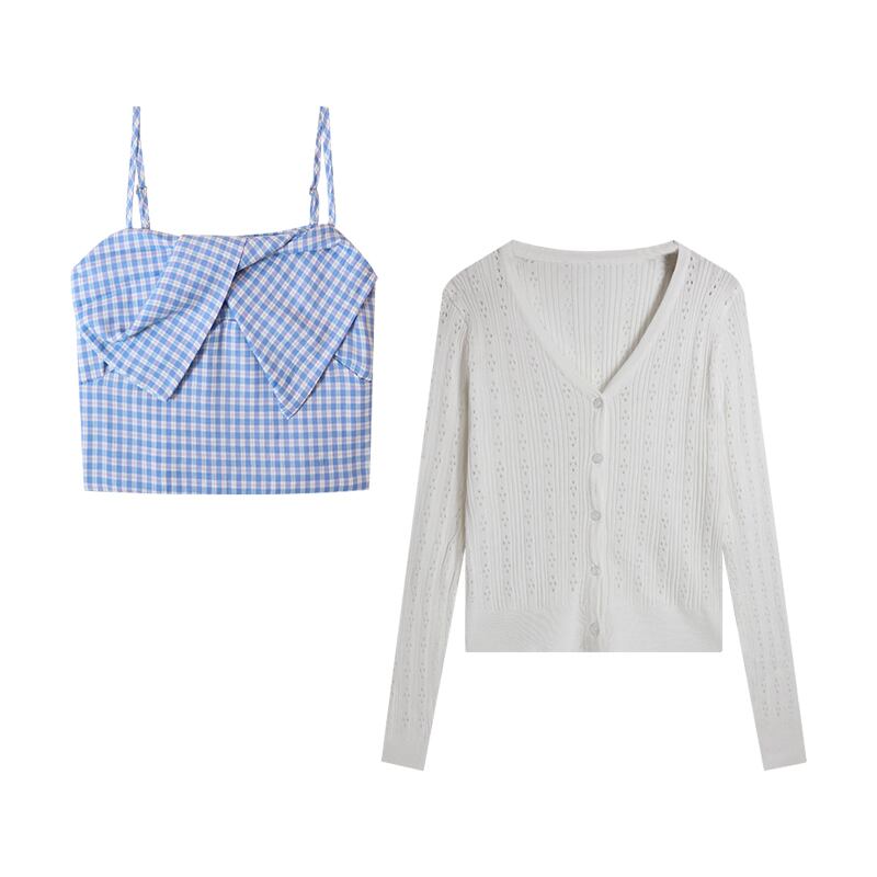 色:格子縞のスリング,透かし彫りニットカーディガン