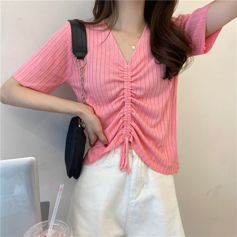 サマートップス 薄手Tシャツ ショートギャザーVネック 夏物 1号婦人54842624186