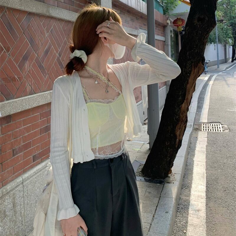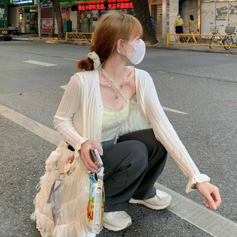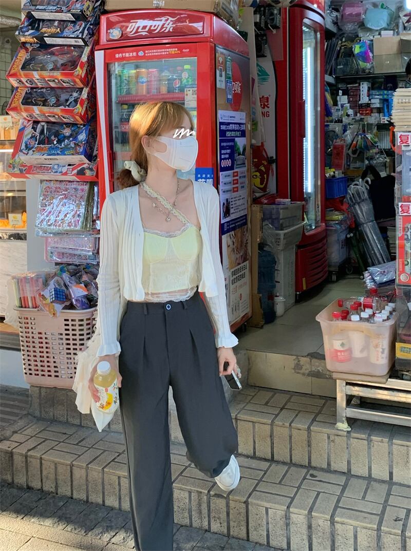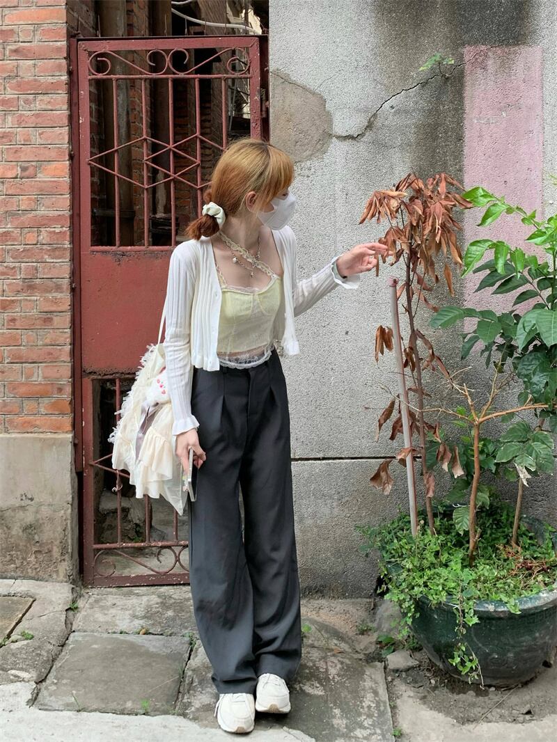 色:白いカーディガン,クリーミーな黄色のスリング,ヘンプグレーパンツ