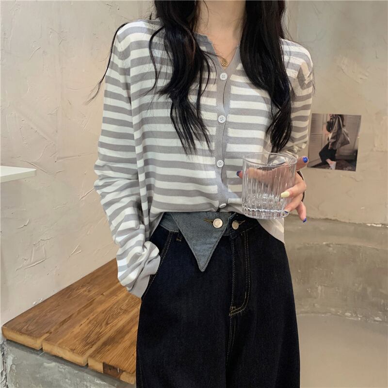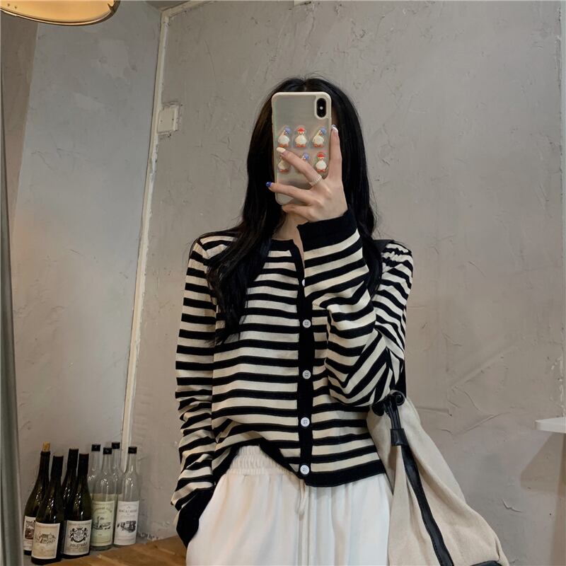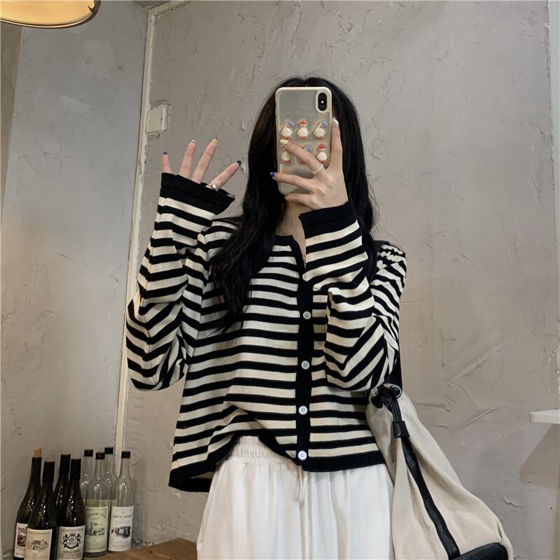 ニットカーディガンオータムスタイルスタンダードストライプブラウス セーター ジャケット ロング レトロ 秋物 1号婦人69554183386