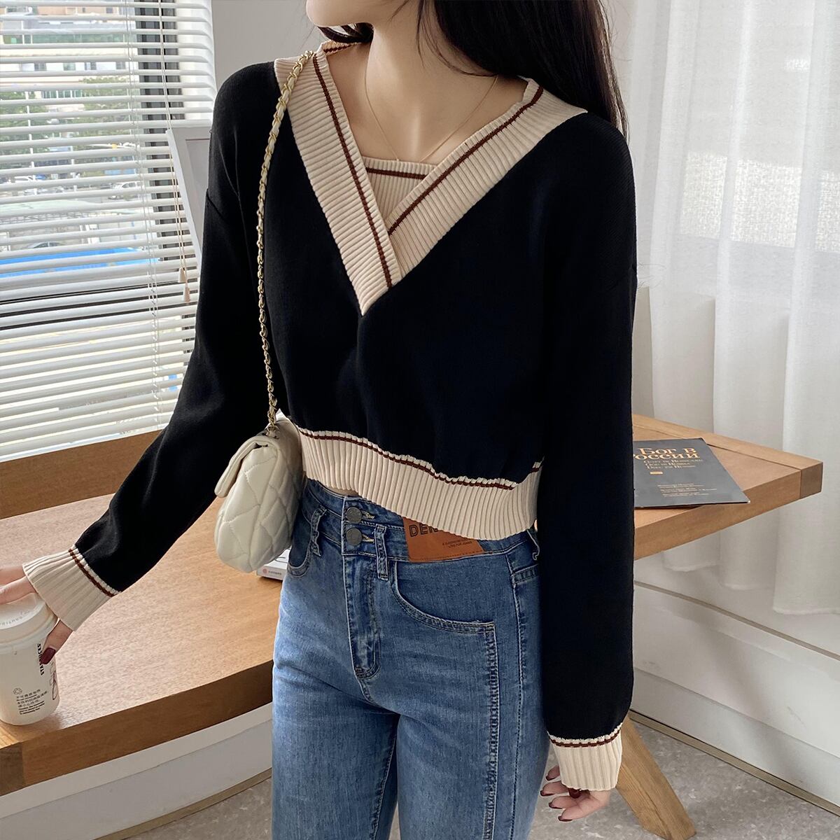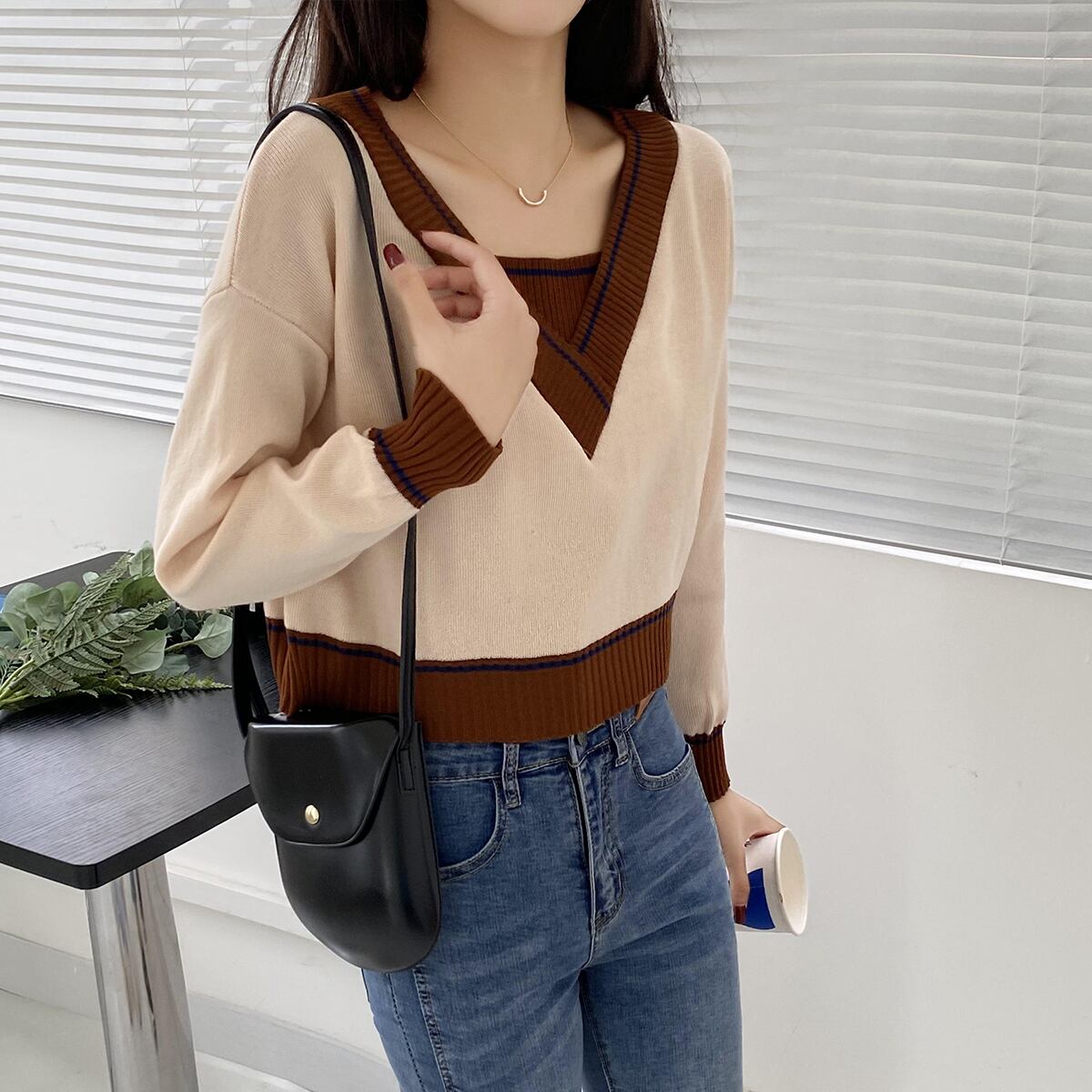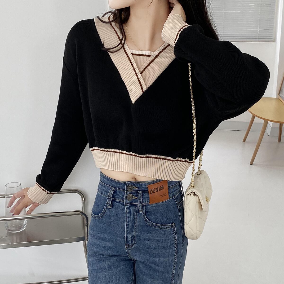 オータムトップス レディースニットセーター ルーズショートVネック長袖スリーブシャツ スプリング ロング 春物 秋物 1号婦人37207630821