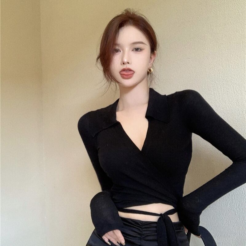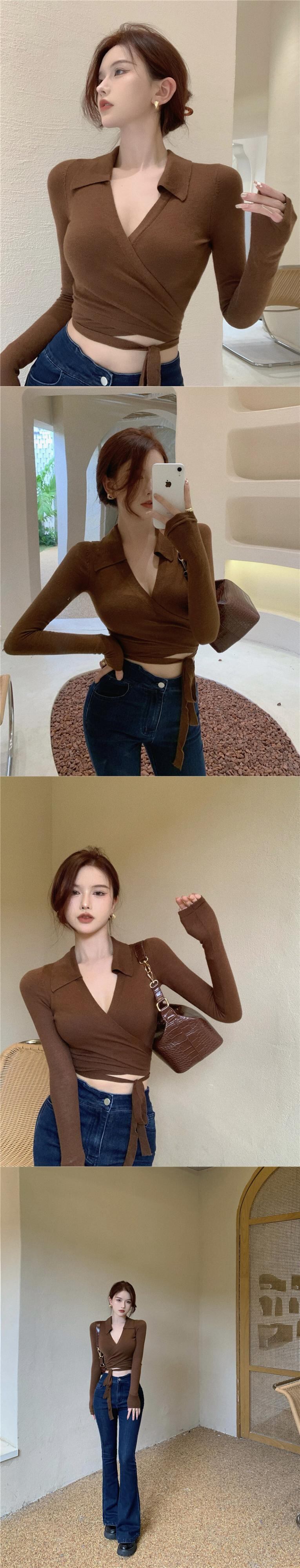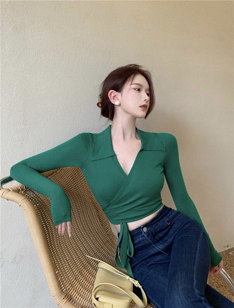 Tシャツ シャツ スプリングオータムスタンダードVネックショートニットスリム レトロ 春物 秋物 1号婦人87296641323