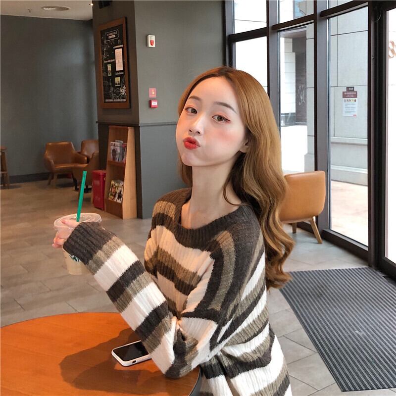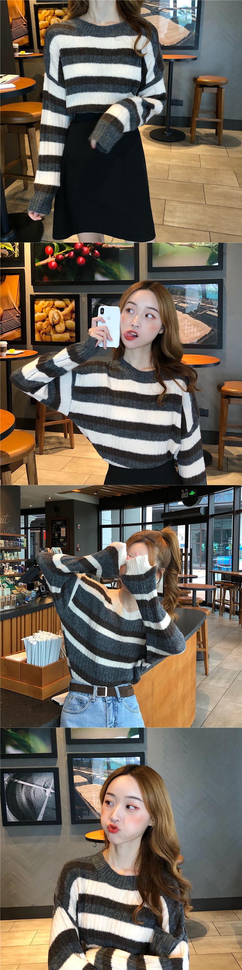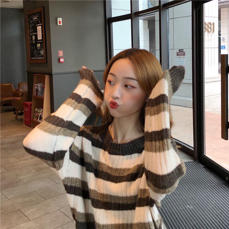 セーター ルーズオータムウィンタースタンダードスタイルストライプトップス ロング レトロ 秋物 冬物 1号婦人4392275676