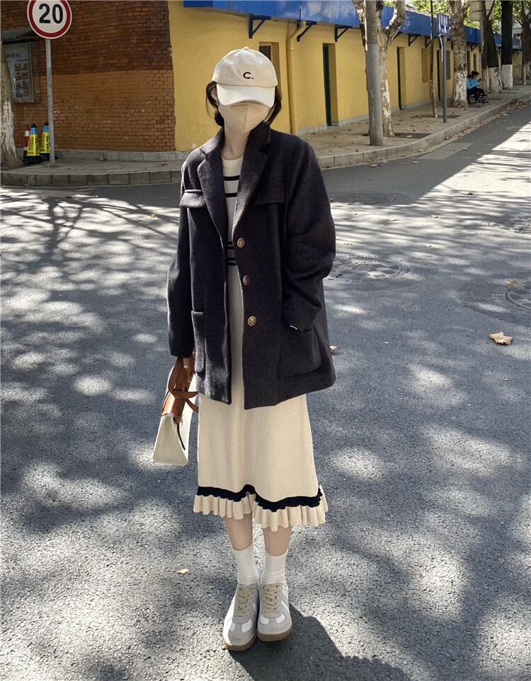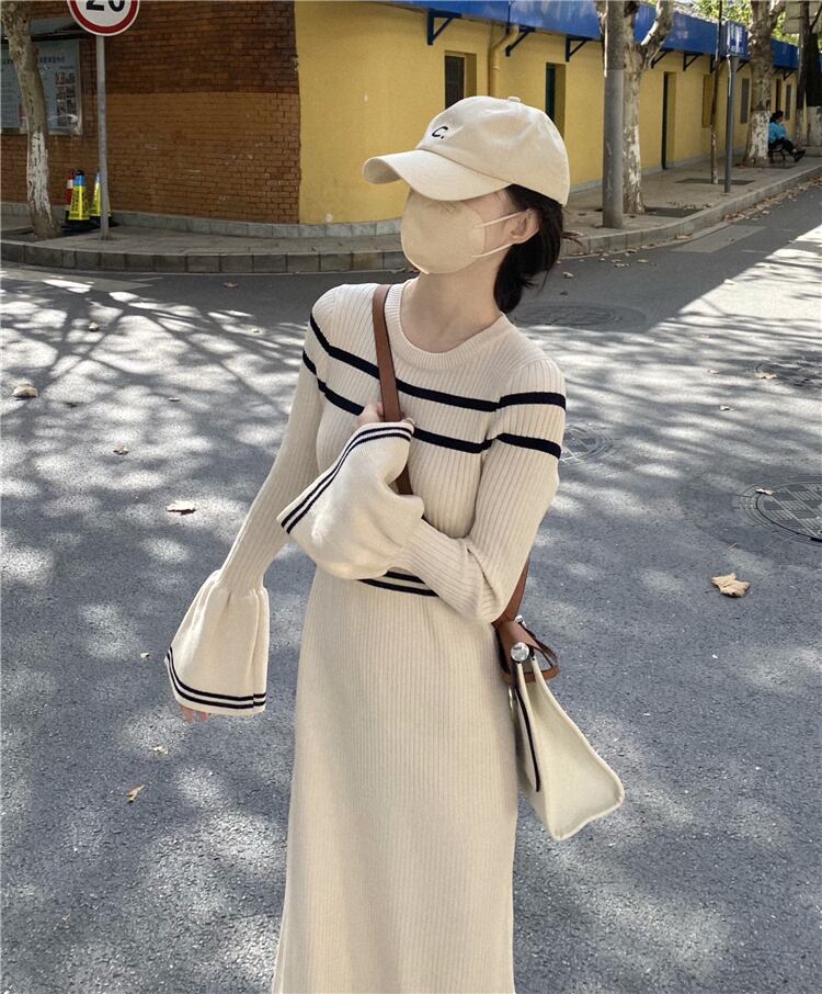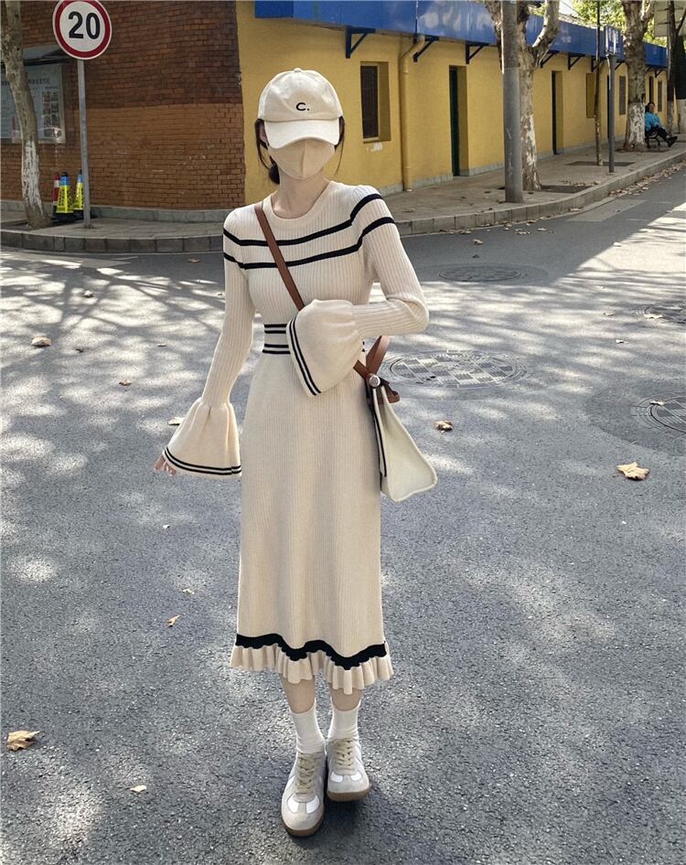 オータムウィンタードレス ワンピース スタイルカラースリーブニットスカート 秋物 冬物 1号婦人45709297734