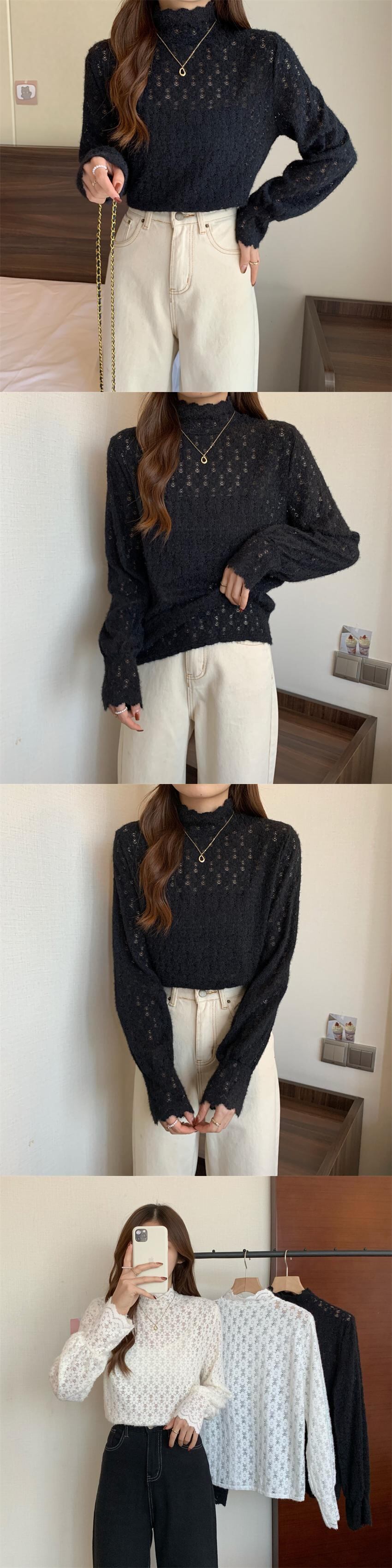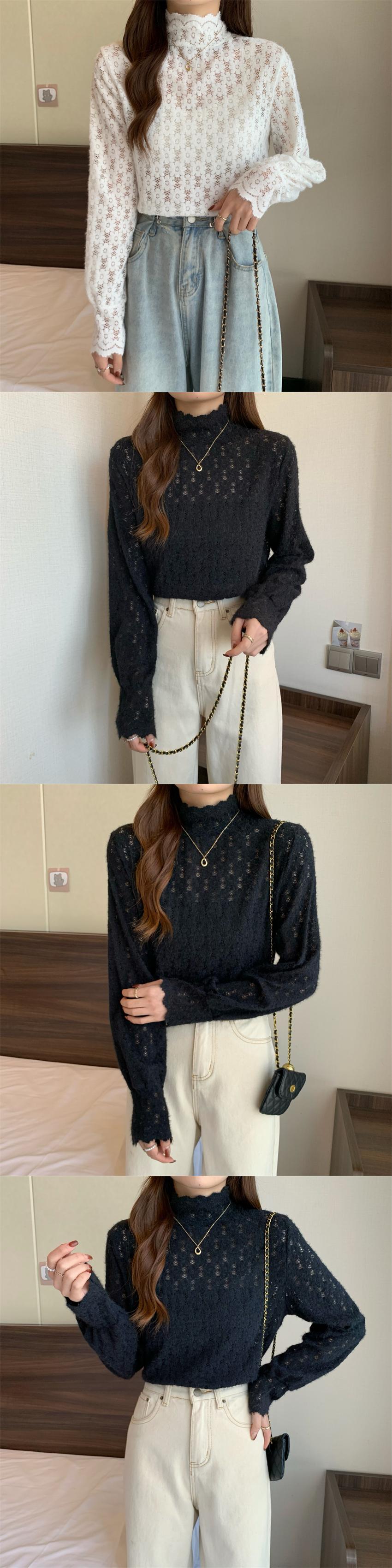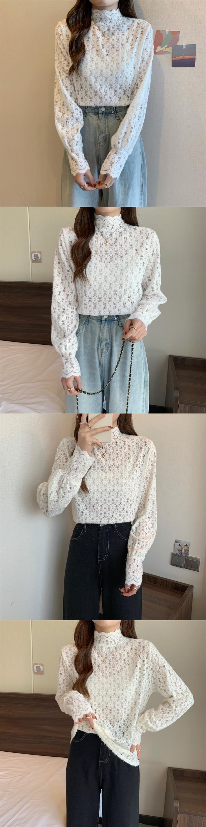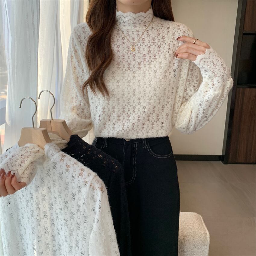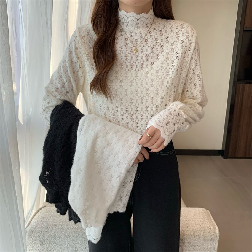 レースシャツ オータムウィンタースタイルカラーホワイトスリムトップス ロング 秋物 冬物 1号婦人4216330179