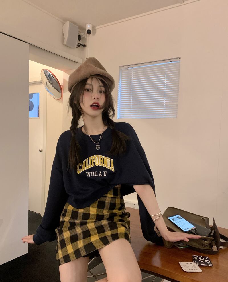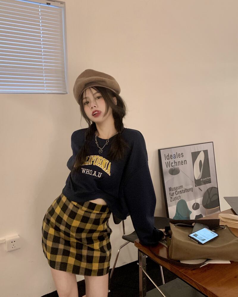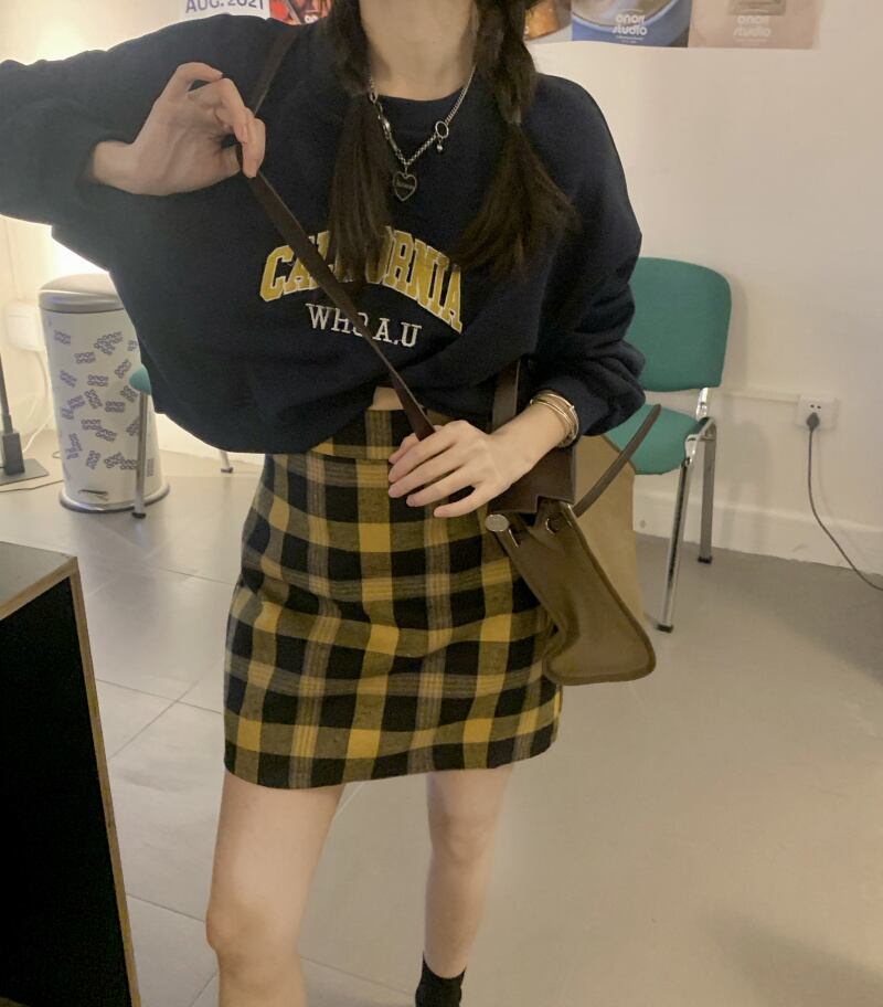 色:紺のセーター,チェック柄スカート