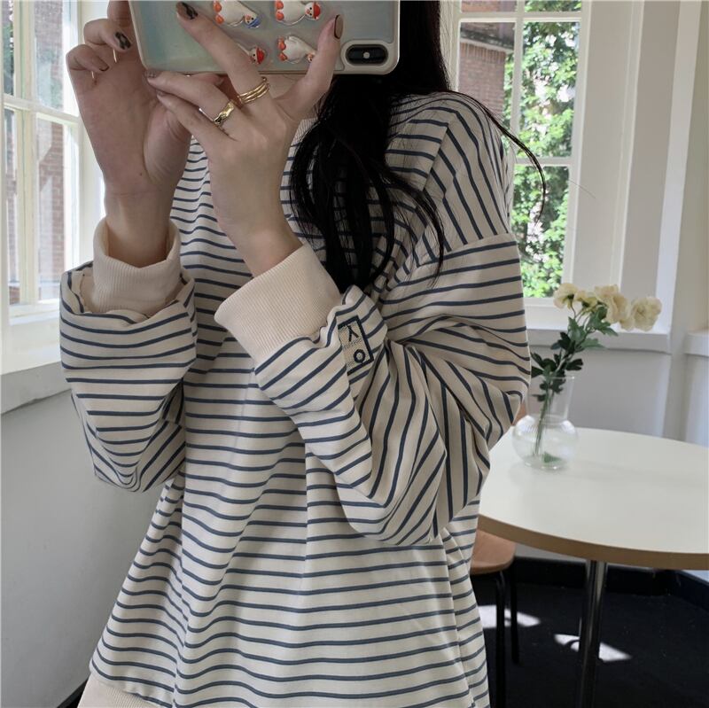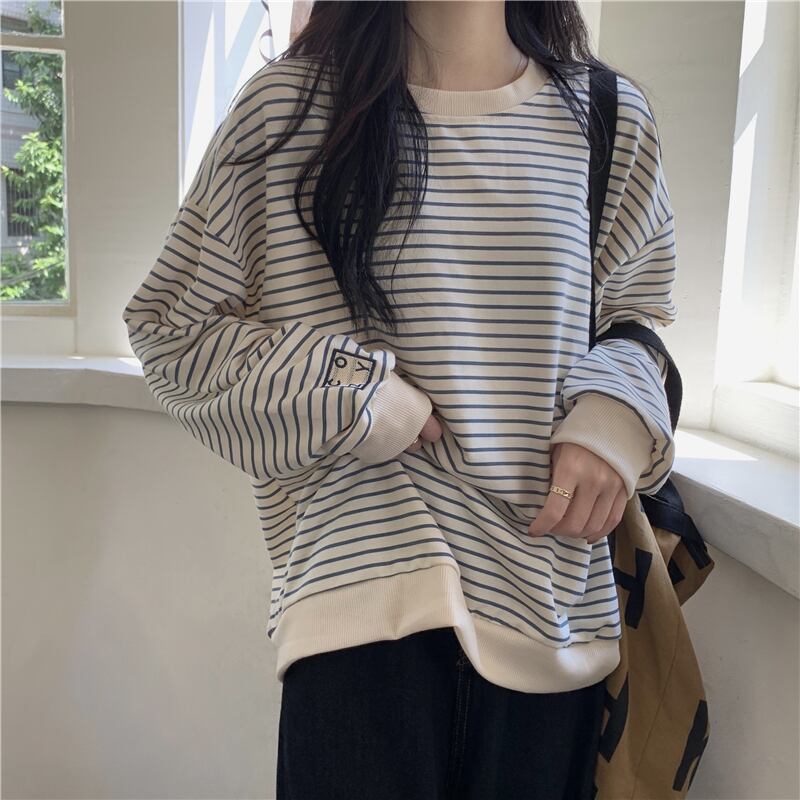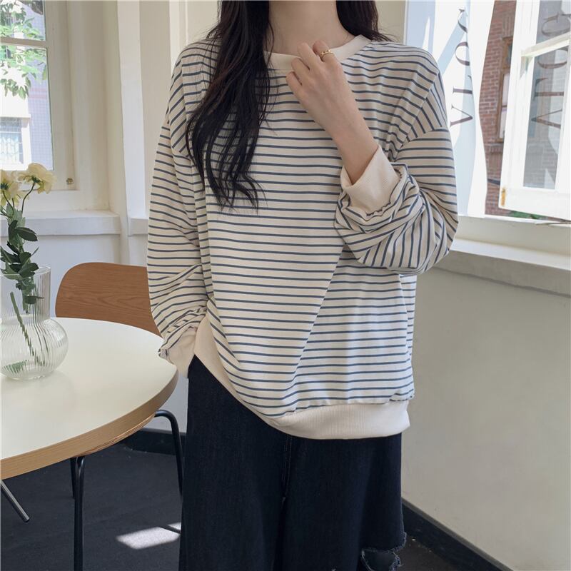 ラウンドネックオータムルーズスタイルストライプトップス コットン 秋物 Oネック 1号婦人99689523027